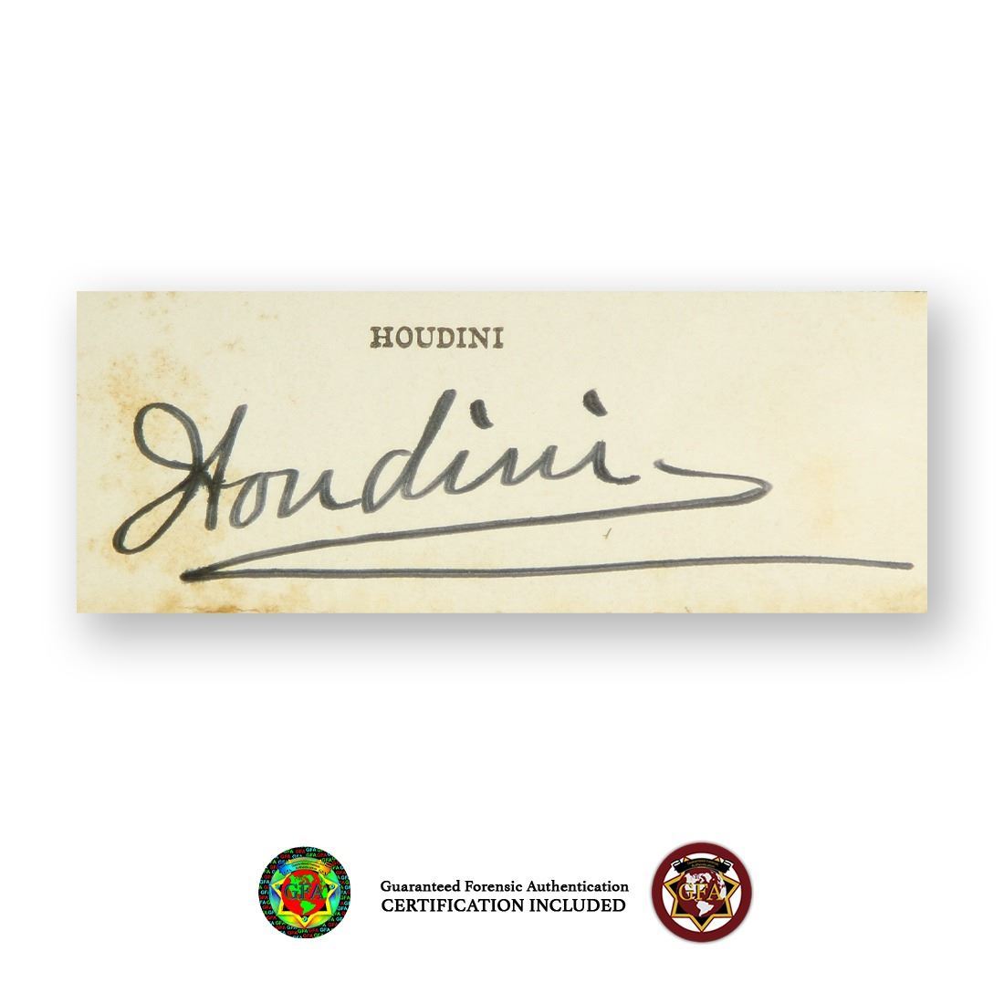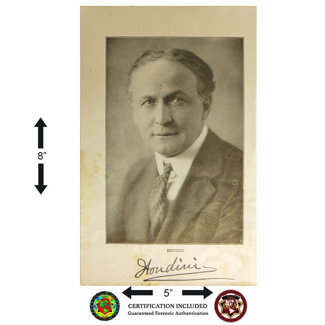 Harry Houdini (March 24, 1874–October 31, 1926). Signed 5 x 8 black and white image. Signed Boldly in black ink. Harry Houdini's grand illusions and daring, spectacular escape acts made him one of the most famous magicians of all time. Fascinated with magic from a young age, Harry Houdini began performing and drew attention for his daring feats of escape. In 1893, he married Wilhelmina Rahner, who became his onstage partner as well. Houdini continued performing escape acts until his death, on October 31, 1926, in Detroit, Michigan. Comes with a Letter of Authentication from Guaranteed Forensic Authenticators (GFA), along with the GFA guarantee of authenticity.