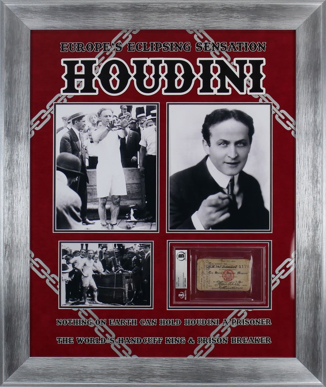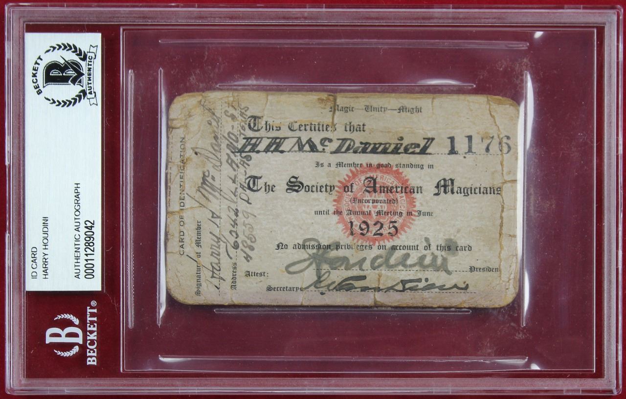 This Autographed & Framed 2.5x4 Society Of American Magicians Identification Card has been personally Signed by Harry Houdini. This item is 100% Authentic, it comes slabbed and authenticated by Beckett Authentication Services. The authenticity can be verified on Beckett Authentication Services website. This item has been professionally framed to overall dimensions of approximately 25.25 x 30 inches.