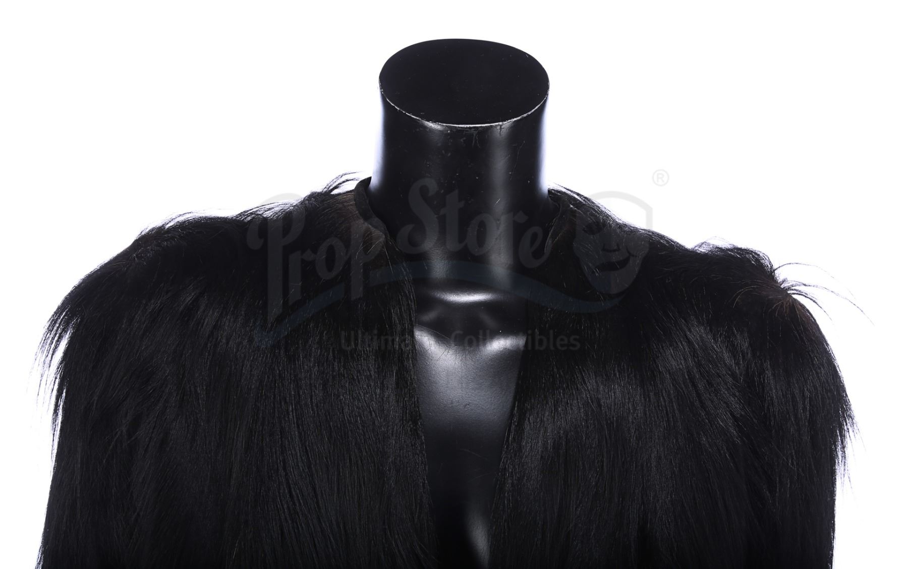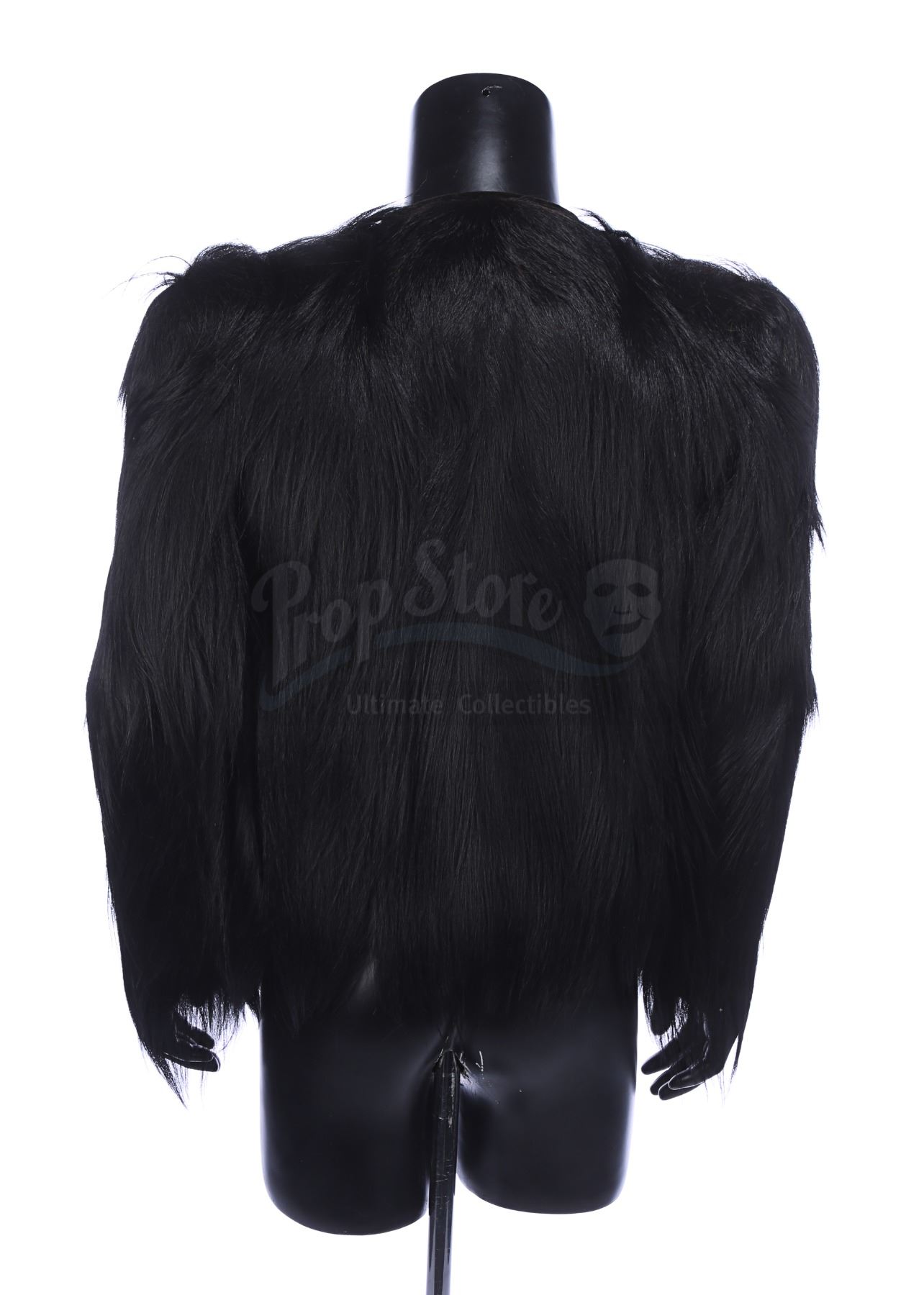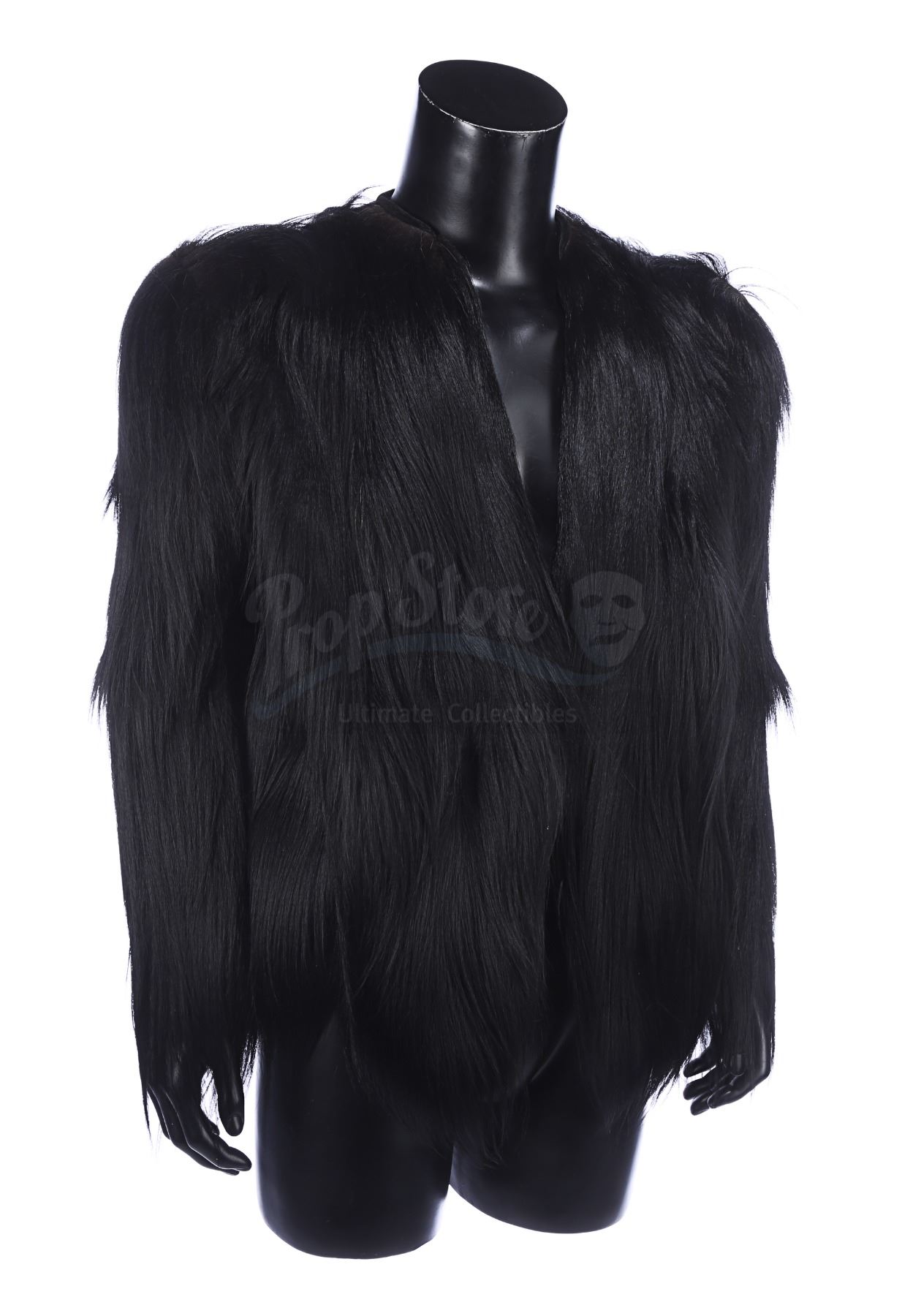 The jacket is leather with long black hair on the outside and black cotton fabric lining the inside. It has velvet piping along the collar and velvet along the inner arm and seams. There is a handwritten label on a small inside pocket that reads "Jarvis", and a handwritten costumier's label on the collar that reads "Jarvis Cocker 'Harry Potter Goblet of Fire IV'". The jacket shows damage to the interior, with a tear near the small pocket, fraying in various spots throughout, and a build up of glitter from use during production.