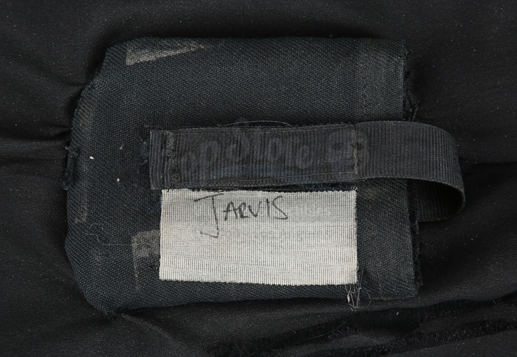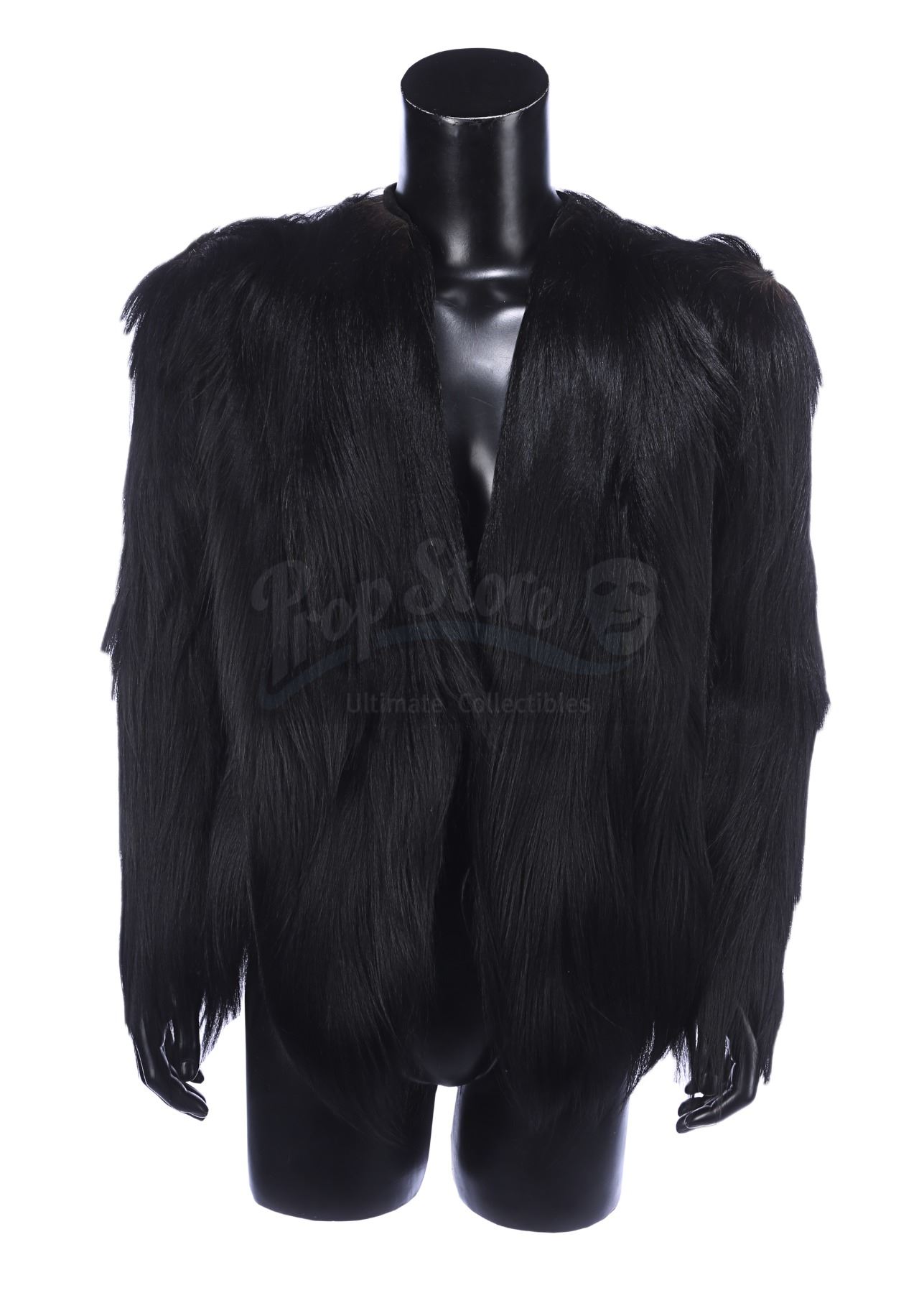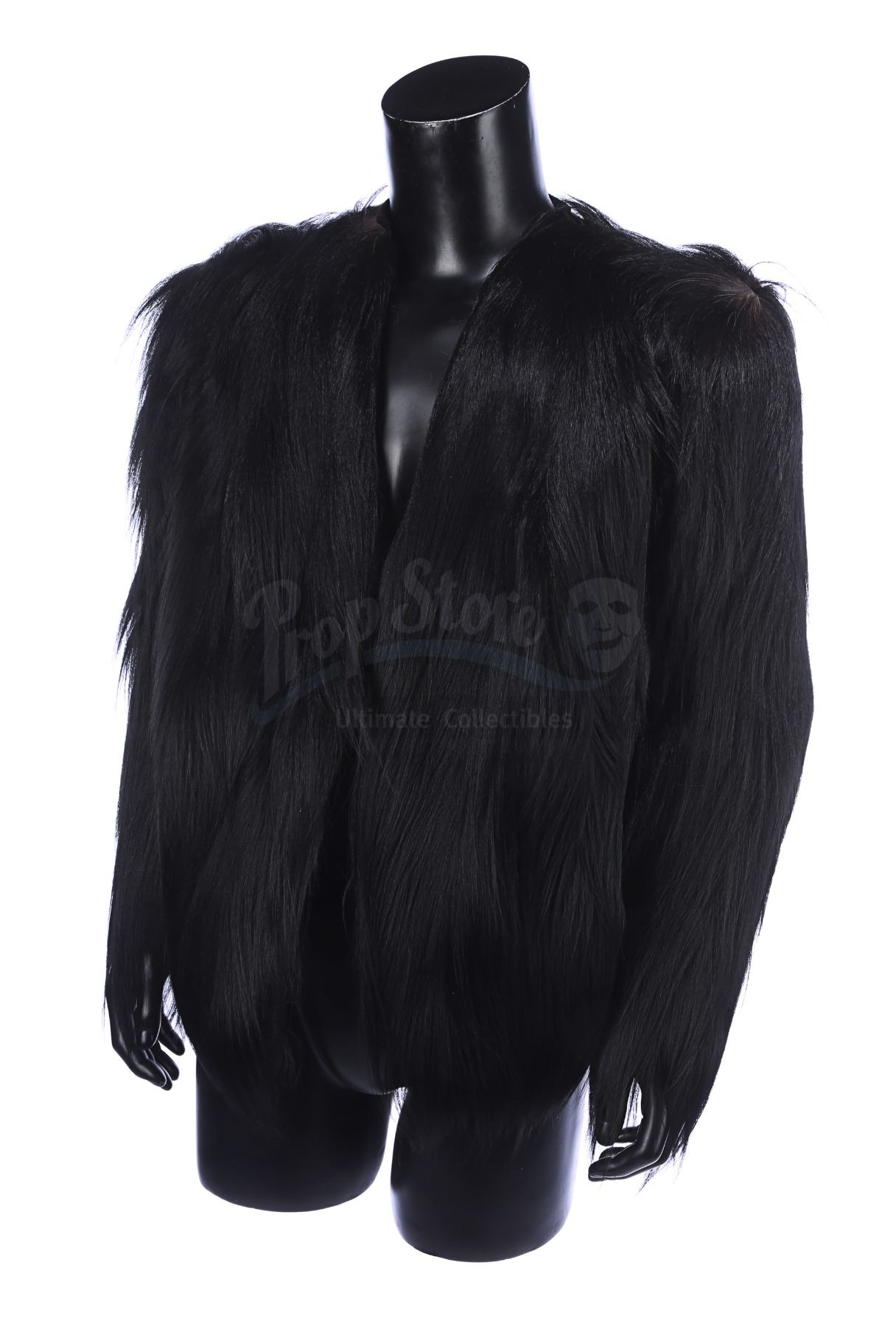 The jacket is leather with long black hair on the outside and black cotton fabric lining the inside. It has velvet piping along the collar and velvet along the inner arm and seams. There is a handwritten label on a small inside pocket that reads "Jarvis", and a handwritten costumier's label on the collar that reads "Jarvis Cocker 'Harry Potter Goblet of Fire IV'". The jacket shows damage to the interior, with a tear near the small pocket, fraying in various spots throughout, and a build up of glitter from use during production.