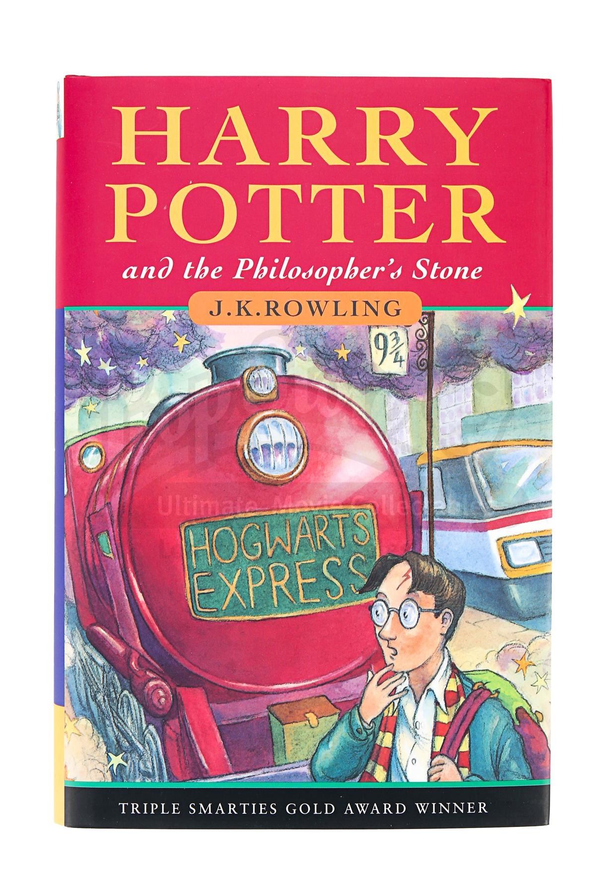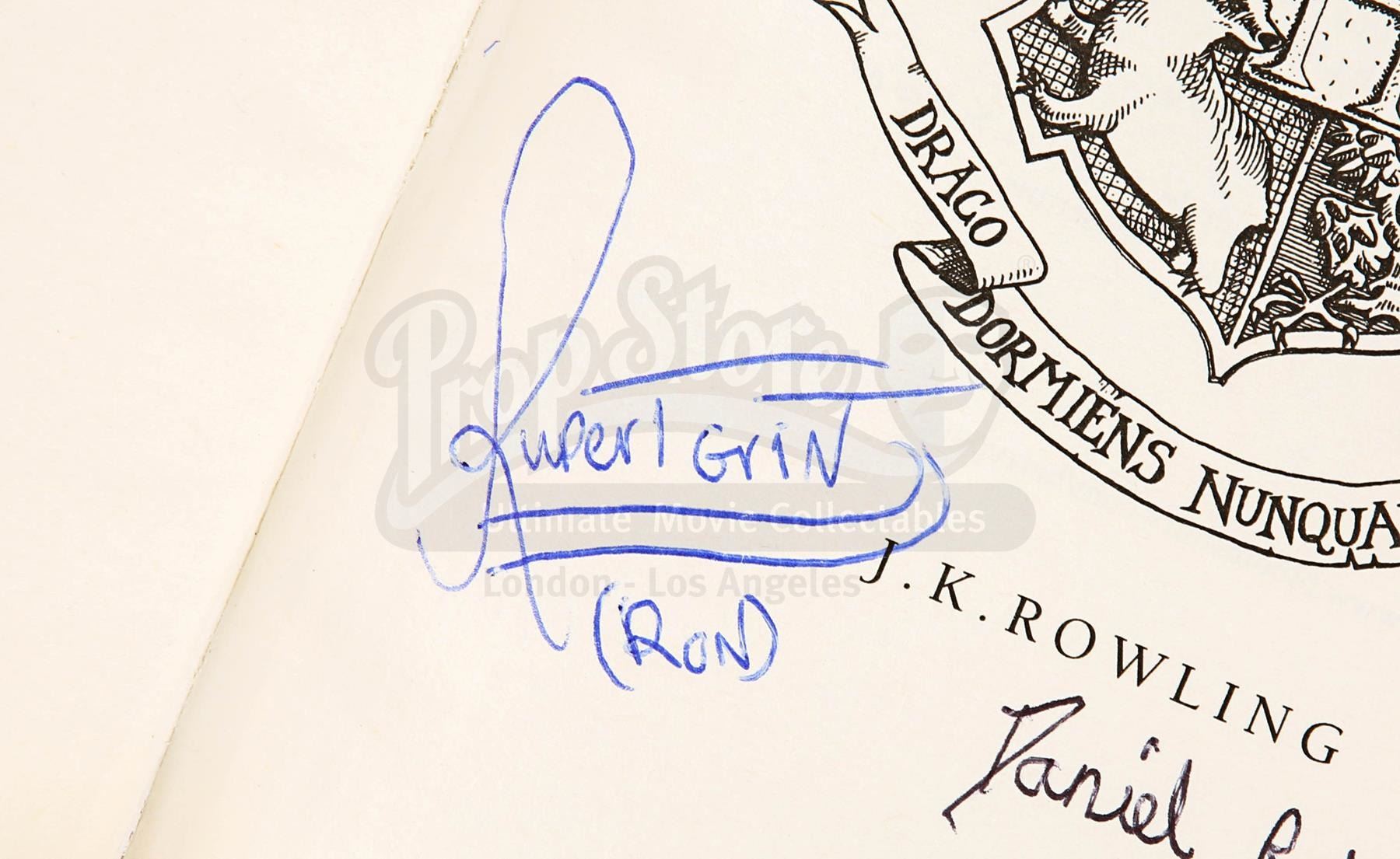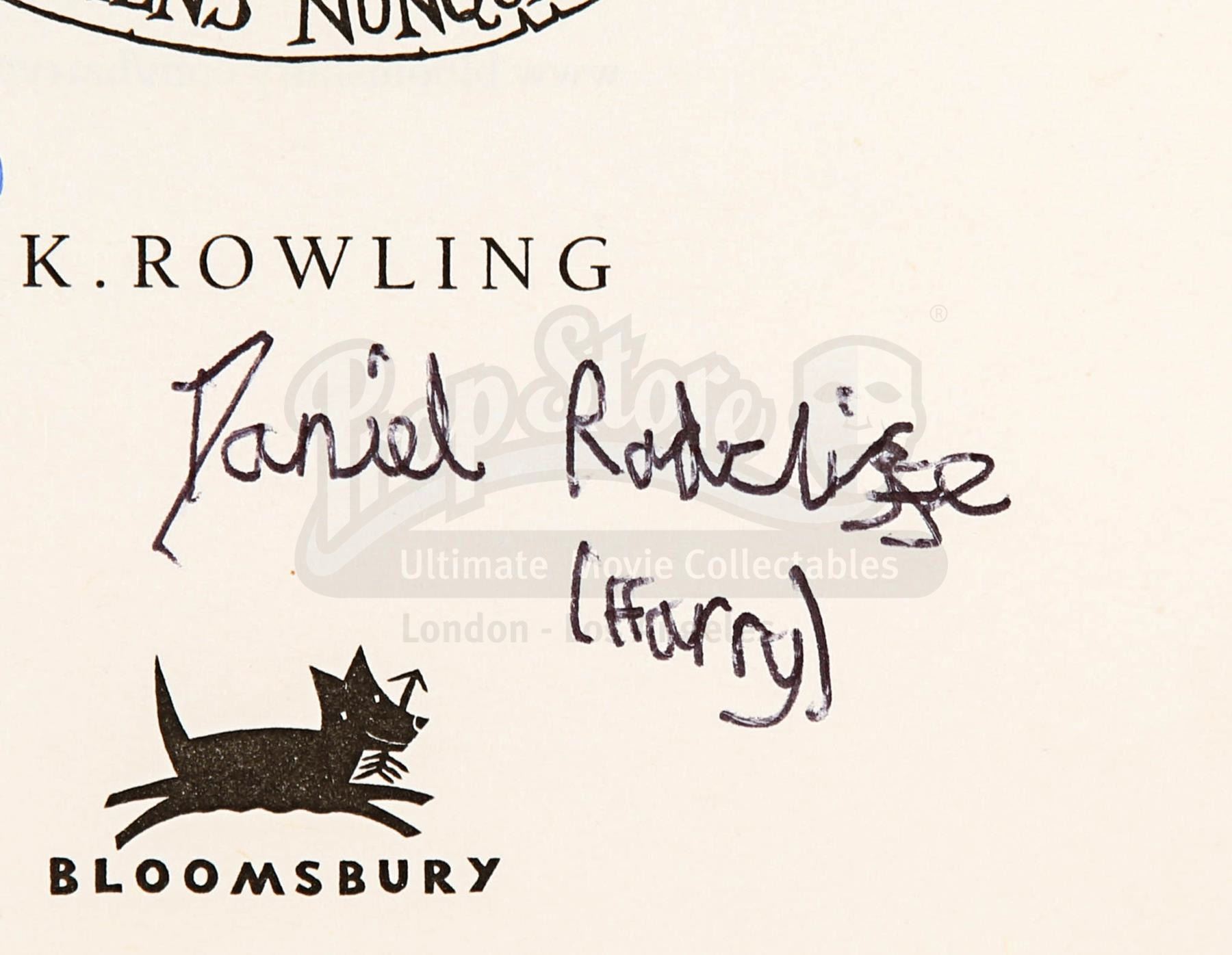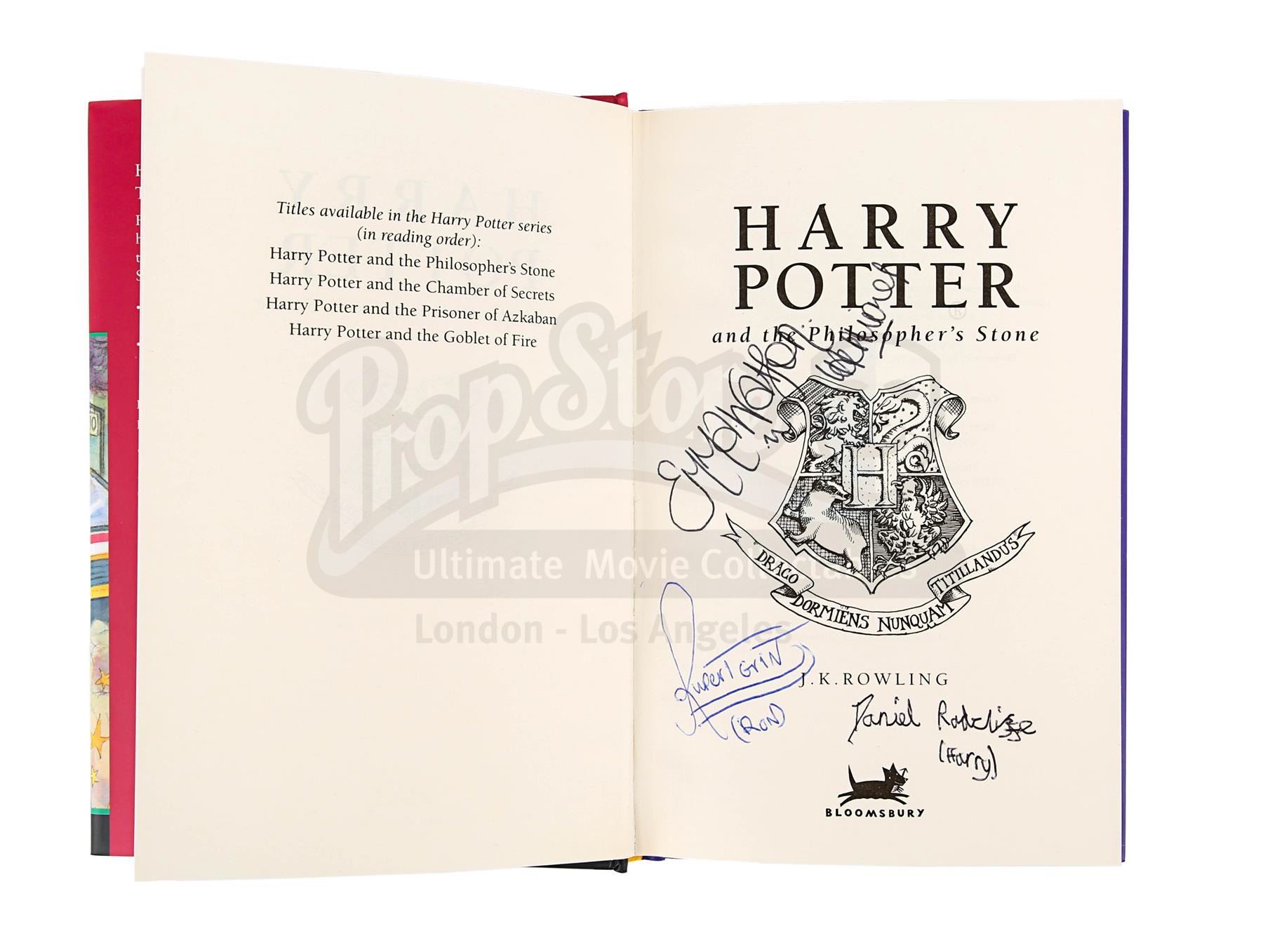 A copy of the novel Harry Potter and the Philosopher's Stone autographed by the three principal actors from the film adaptation. The hardback book, from the 29th print run, is autographed by Daniel Radcliffe, Emma Watson and Rupert Grint in black and blue ballpoint pen on the title page, and features cover artwork of Harry in front of the Hogwarts Express at King's Cross Station, with an image of Professor Dumbledore on the reverse.