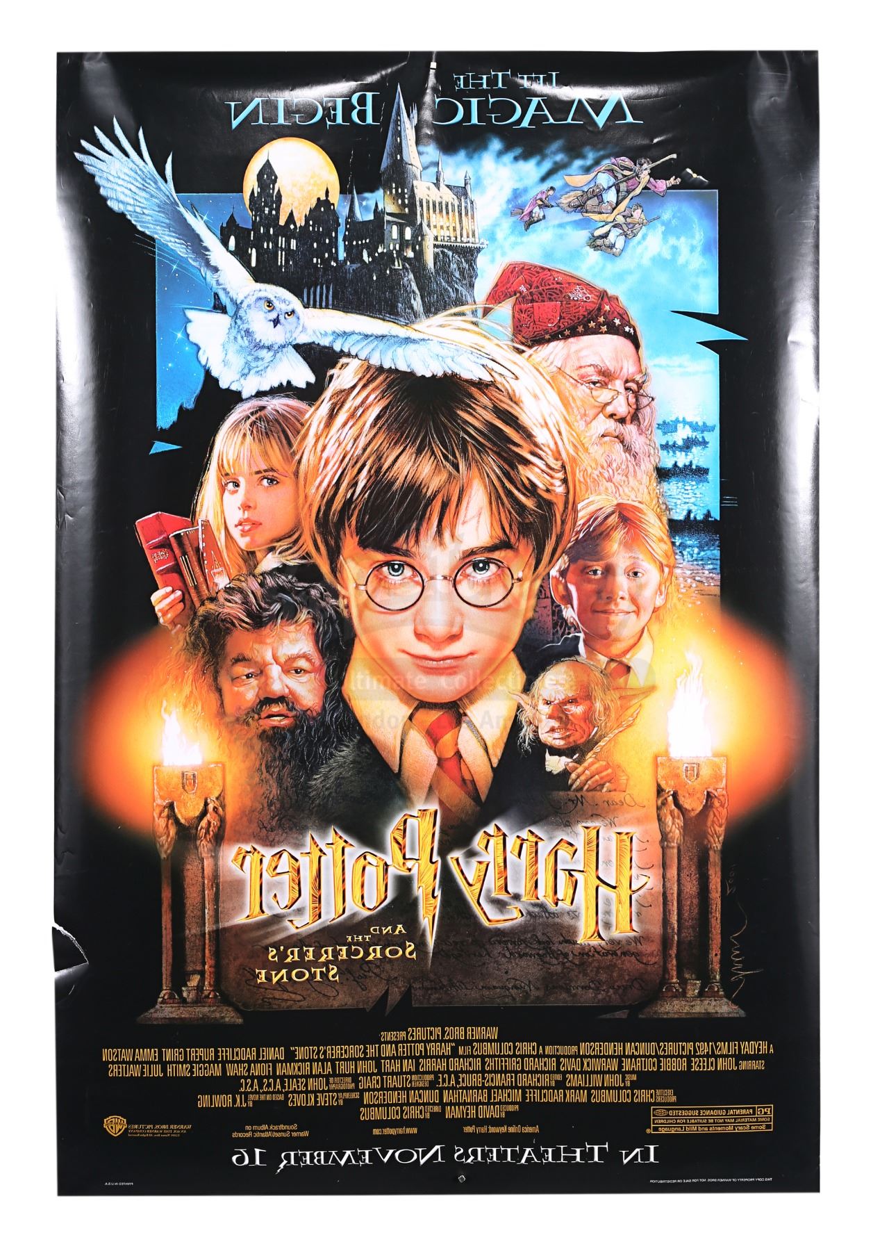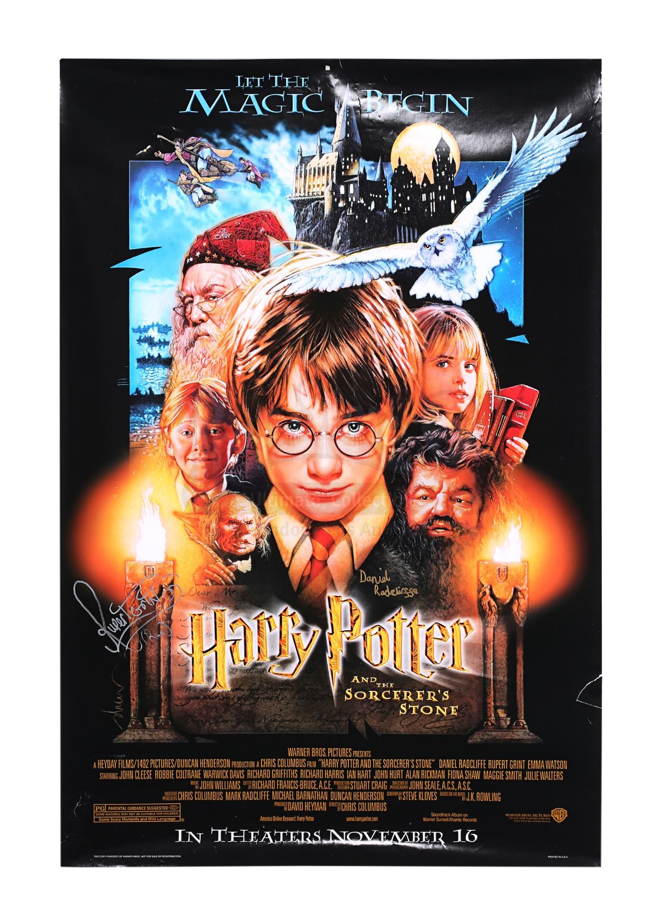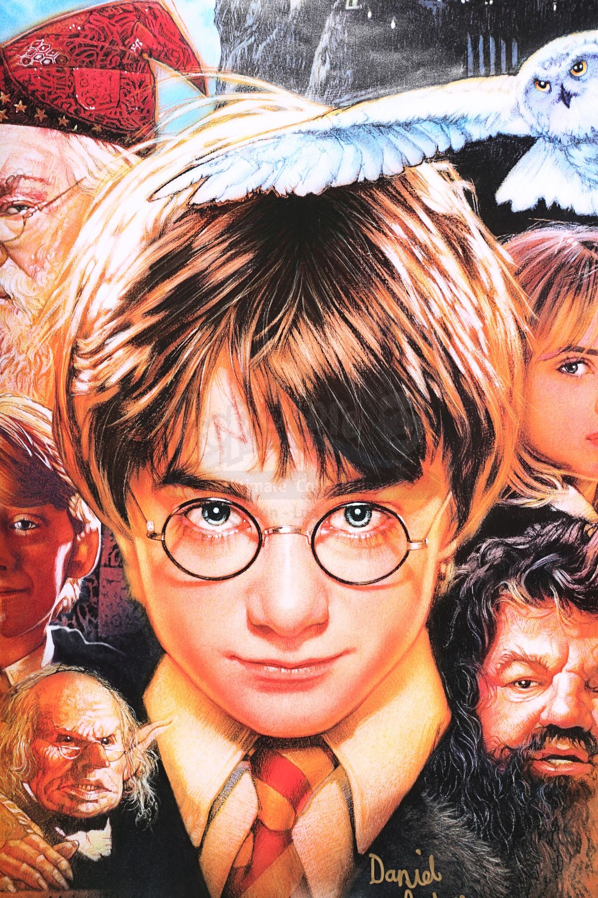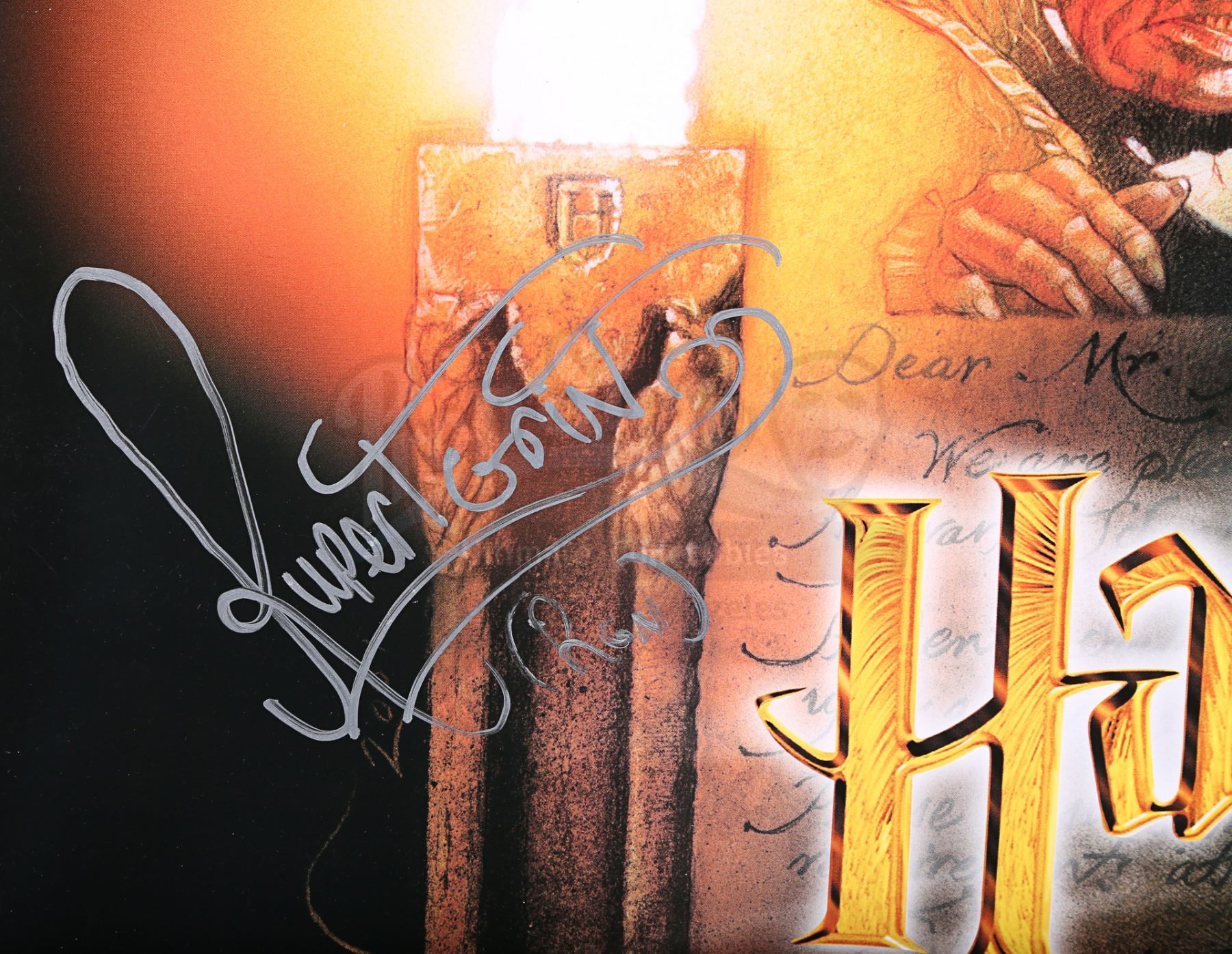 An autographed poster from the promotion of Chris Columbus' fantasy-adventure film Harry Potter and the Philosopher's Stone. Designed by legendary poster artist Drew Struzan, the illustrated image depicts Harry (Daniel Radcliffe), Ron (Rupert Grint), Hermione (Emma Watson), Hagrid (Robbie Coltrane), Dumbledore (Richard Harris), the Gringotts Goblin (Warwick Davis), Hedwig, Hogwarts School, and Quidditch players astride brooms, all above the alternative US release title "Harry Potter and the Sorcerer's Stone".