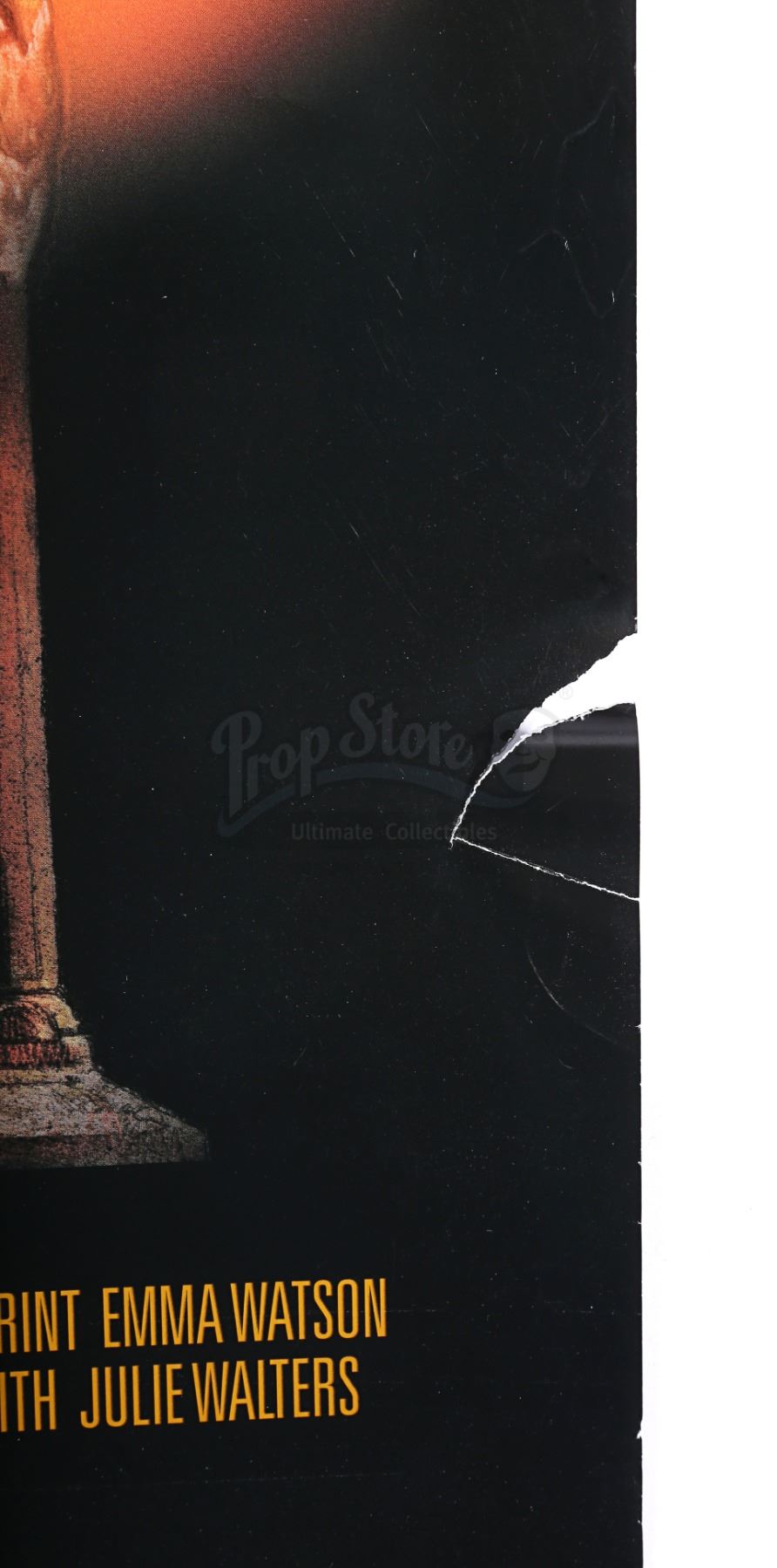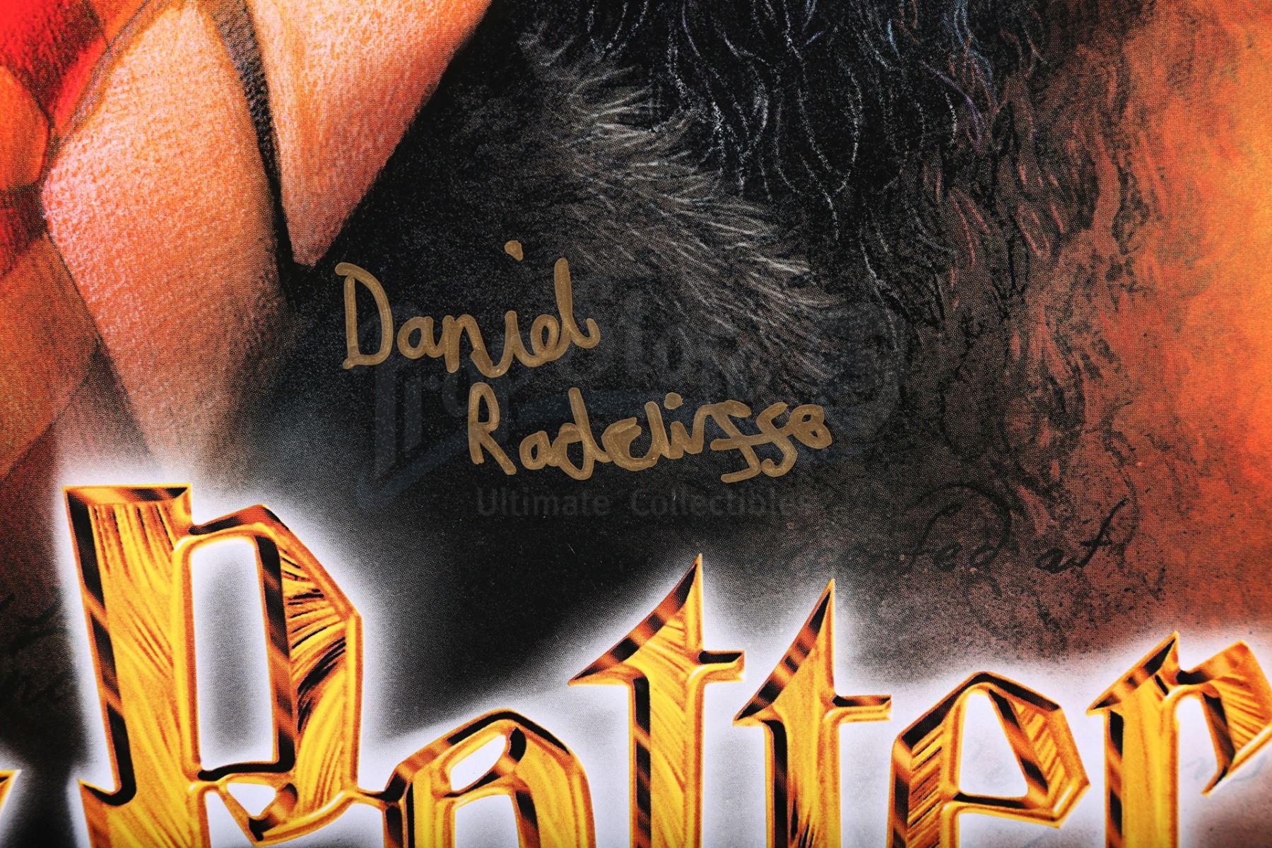 The poster is autographed in gold-coloured pen by Daniel Radcliffe, and in silver-coloured marker by Rupert Grint. It exhibits some minor wear to the corners and light creasing, and there is notable rip on the lower right edge. Dimensions: 69 cm x 101 cm (27" x 40")