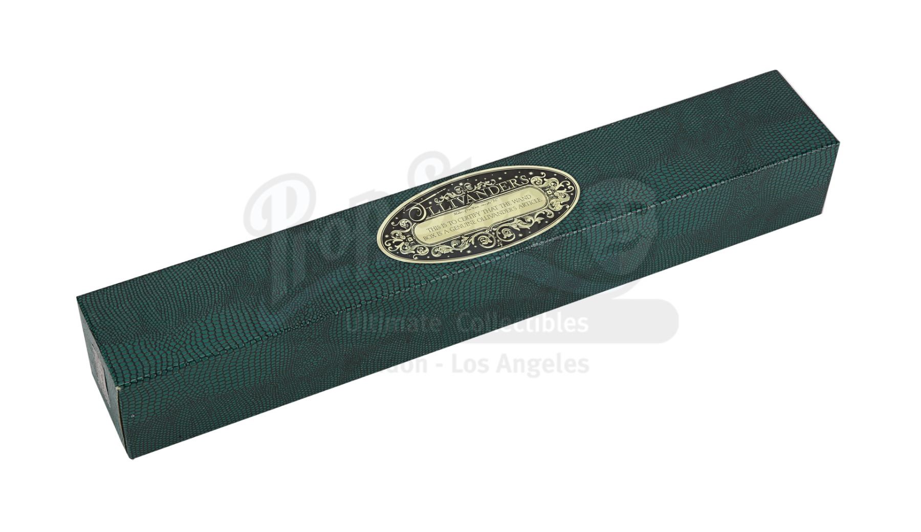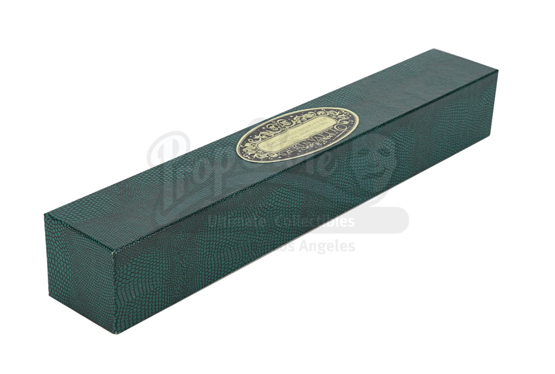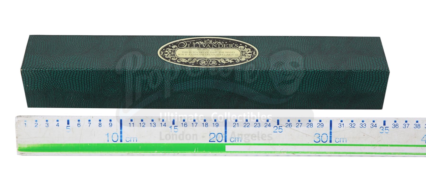 A wand box from Chris Columbus' fantasy-adventure film Harry Potter and the Philosopher's Stone. Stacks of boxes filled the shelves of Ollivanders, the shop Harry (Daniel Radcliffe) visited in Diagon Alley to purchase a wand. These boxes were gifted to attendees of the film's world premiere at Leicester Square in 2001.