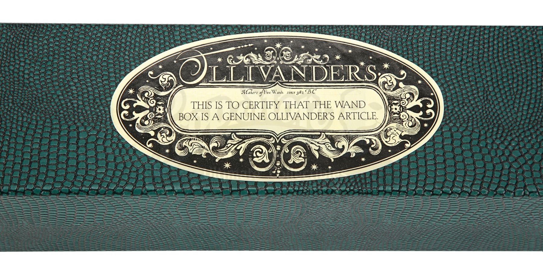 Made of cardboard and sealed shut, the box's lid features a green faux-crocodile skin effect and a golden Ollivanders-branded label. A smaller sticker displaying the wand-maker measurement "744" is located on the left end. Minimal signs of wear are present on the top corners and along the bottom edges. Dimensions: 36 cm x 5.5 cm x 5.5 cm (14 1/4" x 1 1/4" x 2 1/4")