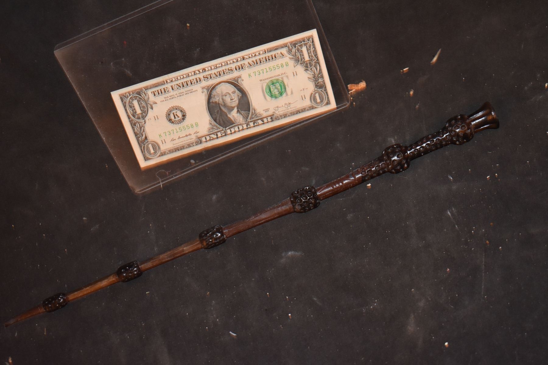 This is a Dumbledore stunt want used as a paint test. You can see where they tested several color schemes. May have seen some use as the tip is frayed slightly.