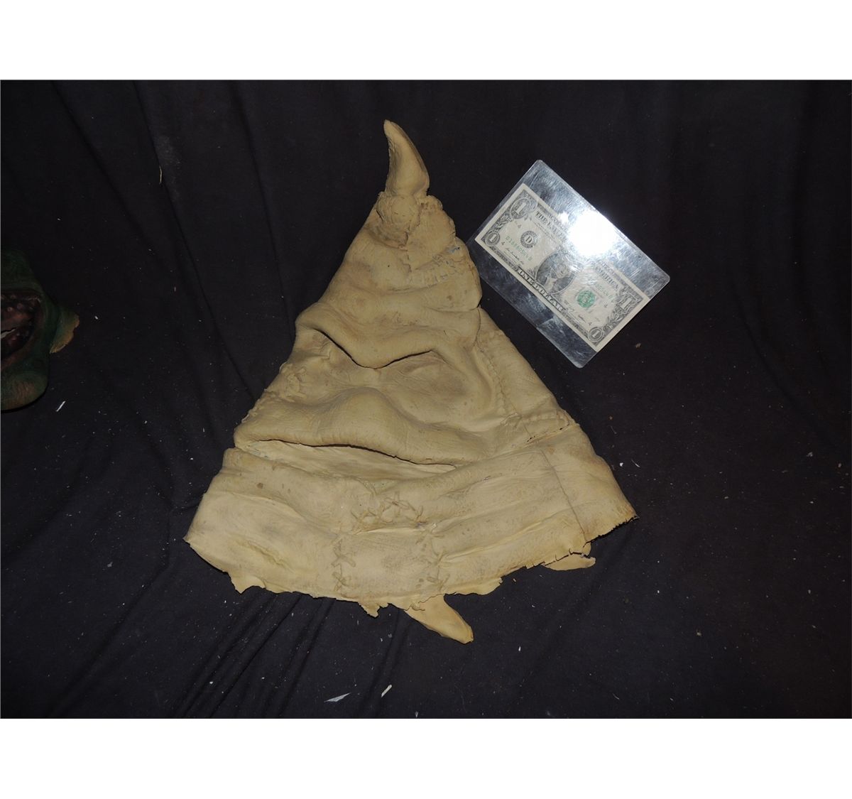 Originally the Sorting Hat in the first Harry Potter film was going to be a puppet. They ended up going CGI, but this is the test skin for the original proposed puppet. There are some slight differences in the sculpt, but you can see it is very similar. This is a full sculpt, and goes all the way around.
