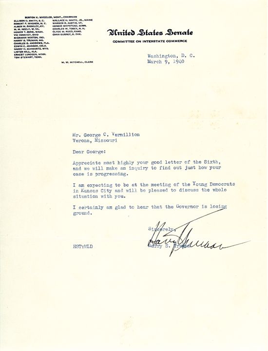 Senator “Harry Truman” Writes “... I certainly am glad to hear that the Governor is losing ground."