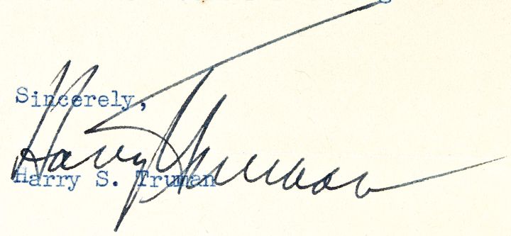March 9, 1940-Dated, Typed Letter Signed, “Harry Truman” as Senator, on "United States Senate-Committee On Interstate Commerce" official letterhead, 1 page, 10.5” x 8” at Washington, D.C., Choice Extremely Fine. This letter typed in bright blue to George C. Vermillion of Missouri, thanking him for his previous letter, and promising to, in part: "... make an inquiry to find out just how your case is progressing. I am expecting to be at the meeting of the Young Democrats in Kansas City… I certainly am glad to hear that the Governor is losing ground." Boldly and vividly fully signed, “Harry Truman” measuring about 3” long in deep black. An impressive clean letter, having good political content and comment.