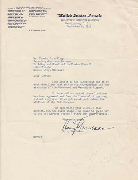 (1884 - 1972) 33rd President of the United States who led the country in the closing days of World War II and through the re-building of Europe under the Marshall Plan and the Korean War. T.L.S. 1p. 4to., on Senate Committee on Interstate Commerce letterhead, Washington, Sep. 8, 1941 to Mr. Perrin D. McElroy of Kansas City regarding the construction of the Greenwood and Grandview airports. In part: "...To date neither one of these locations has been approved and from the looks of things now, I doubt very much if we get an airport unless the attitude of the CAA changes..." With engraving.