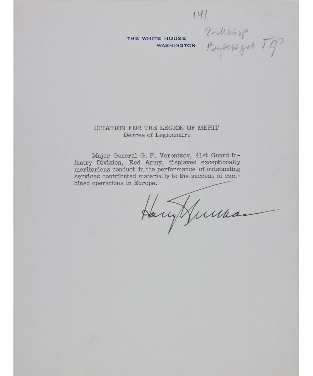 (1884 - 1972) 33rd President of the United States who led the country in the closing days of World War II and through the rebuilding of Europe under the Marshall Plan and the Korean War. Rare typed D.S. "Harry Truman" as President, 1p. 4to., on White House Letterhead., Washington, [n.d., c. April 1946] awading a "CITATION FOR THE LEGION OF MERIT Degree of Legionnaire" onto "Major General G. F. Vorontov, 41st Guard Infantry Division, Red Army, displayed exceptionally meritorious conduct in the in the performance of outstanding services contributed materially to the success of combined operations in Europe." Accompanied by Vorontzov's offical citation document, signed by Secretary of War, ROBERT P. PATTERSON, 1p. oblong folio, Washington, Apr. 9, 1946. Together, two pieces in fine condition.