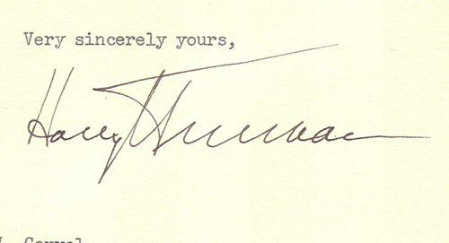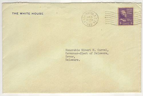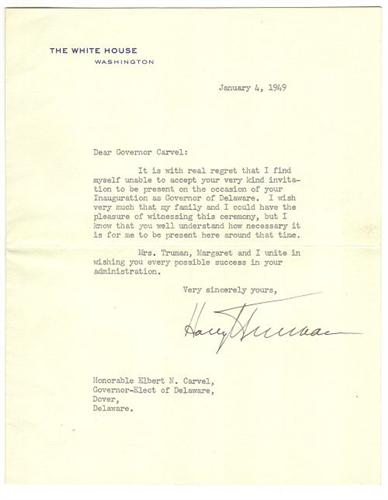 HARRY TRUMAN TYPED LETTER SIGNED. Typed letter boldly signed "Harry Truman" on 6 15/16" x 8 13/16" White House stationary, Washington, D.C., January 4, 1949. Note to then Governor-Elect Elbert N. Carvel (Governor of Delaware 1949-1953, 1961-1965) expressing regret for his inability to attend Carvel's Inauguration. Comes with original envelope addressed to "Honorable Elbert N. Carvel/Governor-Elect of Delaware/Dover/Delaware" and postmarked January 5, 1949.