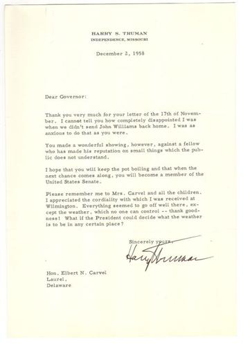 HARRY TRUMAN TYPED LETTER SIGNED. Typed letter boldly signed "Harry Truman" on 7.25" x 10.5" Harry S. Truman stationary, Independence, Missouri, December 2, 1958. Note to the Honorable Elbert N. Carvel (Governor of Delaware 1949-1953, 1961-1965) expressing thanks for his letter dated November 17, 1958 and expressing disappointment in Carvel's loss to John J. Williams for Senator. Shows paper clip mark at top left. Comes with original envelope addressed to "Hon. Elbert N. Carvel/Laurel,/Delaware" with no postmark. Envelope shows a paper clip mark at top left.