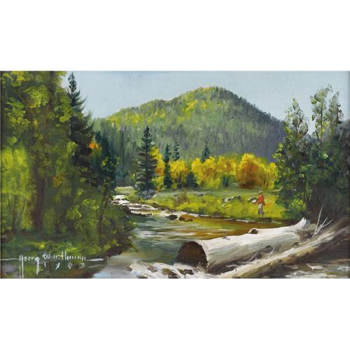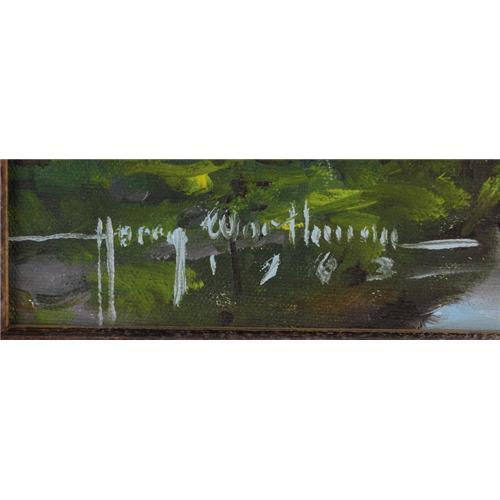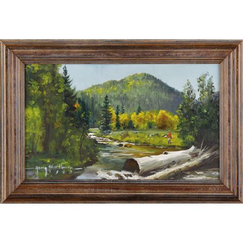 <B>HARRY WORTHMAN (1909-1989)</B></I><BR><I>Fly Fishing, Colorado,</B></I> 1963<BR>Oil on canvasboard<BR>10in. x 16in.<BR>Signed and dated lower left<BR><BR>A light-filled scene trout fishing on the Colorado River. Harry Worthman was both a portrait artist and landscape painter. His extensive clientele for portrait commissions offered him the ability to travel and paint in the United States, Mexico, and abroad.<BR><BR> <B>Condition Report:</B> Excellent condition. Period frame in excellent condition.<BR><BR><b>Shipping:</b> Requires 3rd Party Shipping (<a target="_blank" href="http://www.heritageauctions.com/common/shipping.php">view shipping information</a>)