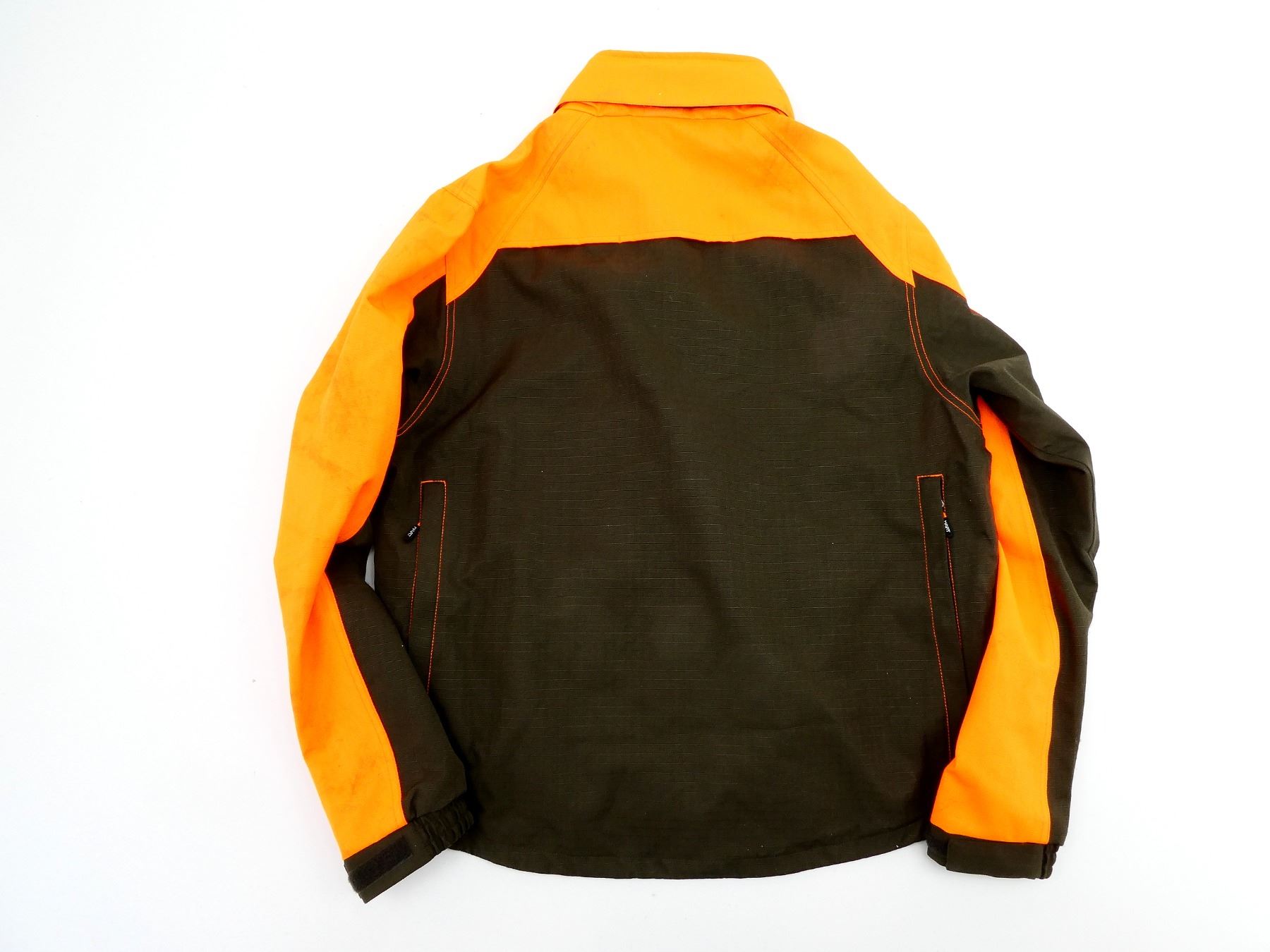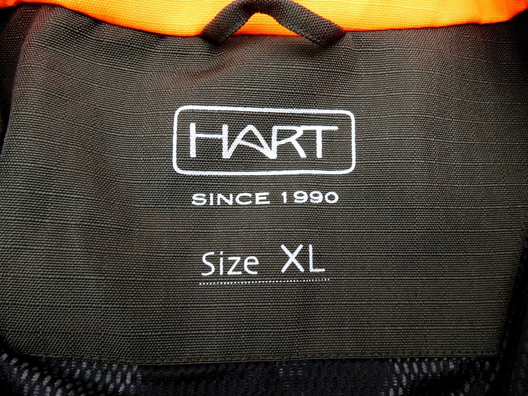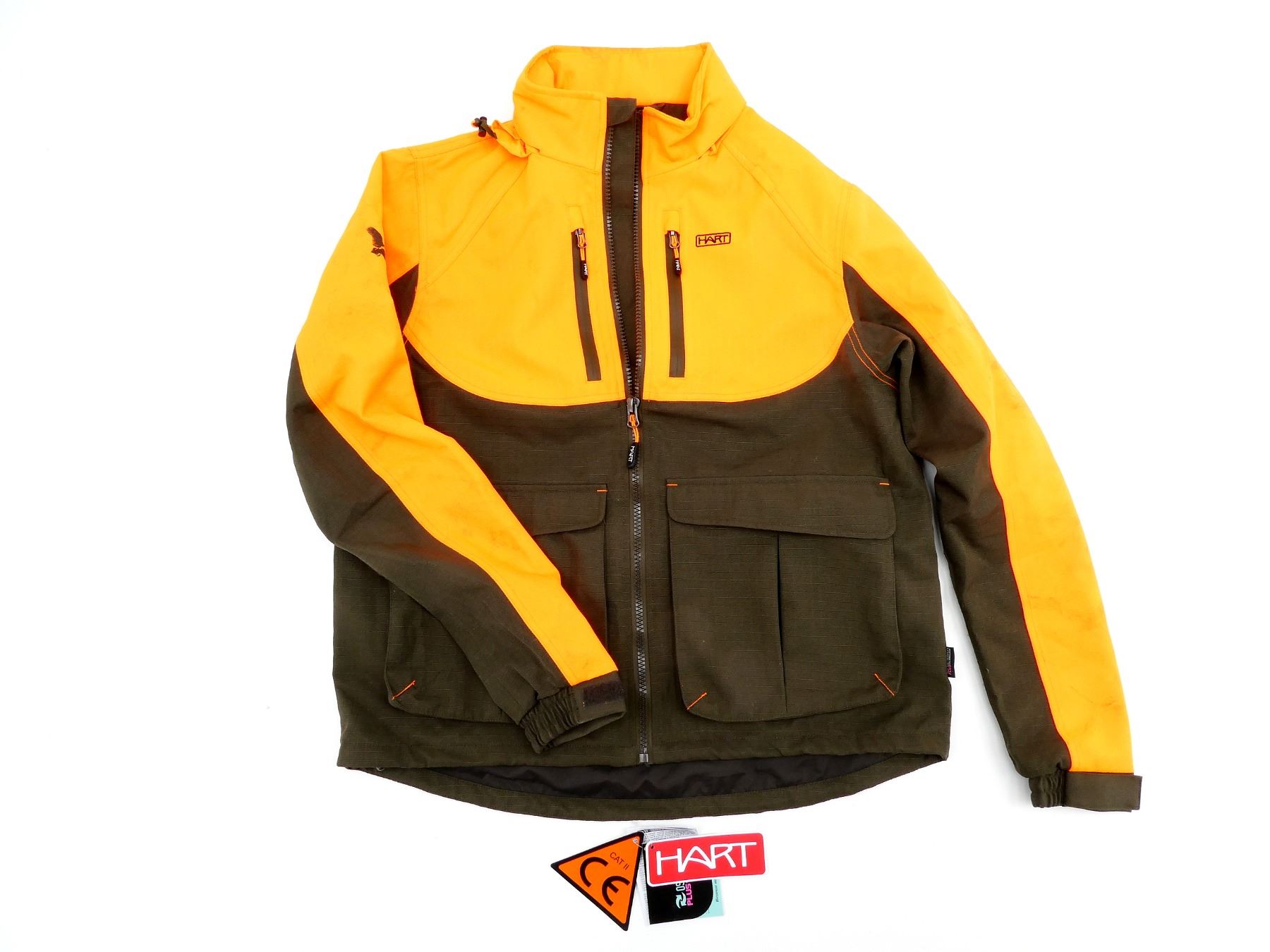 (1) WATERPROOF (10000MM) BREATHABLE (10000 GR/M2) JACKET, ZIPPERED (WORKS), BLAZE ORANGE COLOUR COMBINATION FOR HUNTING, REINFORCED DURABLE RIP-STOP 6000 FABRIC CONSTRUCTION, VARIOUS ZIPPERED POCKETS INCLUDING INTERIOR, MARKED: "HART", "XL", ETC., POSSIBLY NOS ?. SEE PHOTOS.