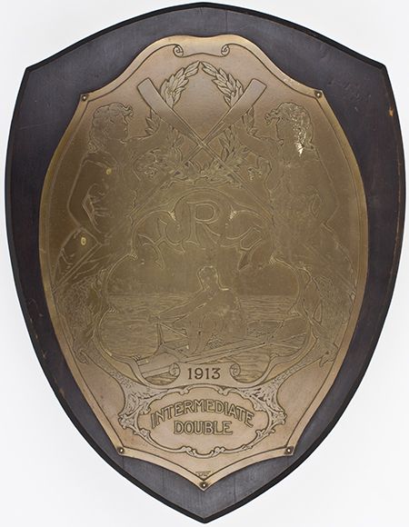 A vintage brass shield from the H.R.A. (Harvard Rowing Athletics) 1913 season, measures 13 1/2" x 18" and mounted to a 15 1/2" x 21" wood shield, it depicts an oarsman in relief with mermaid motif and "Intermediate Double" at bottom. Oxidized as expected, otherwise in very good condition, with a heavy chain at the back for hanging.