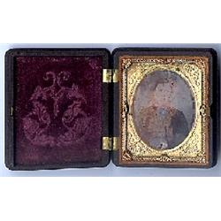 Miserable 1/9 plate ambrotype. Case has a chip next to the clasp on the back, a slightly roughened corner and a trivial roughened spot on one edge. Slight loss of luster.