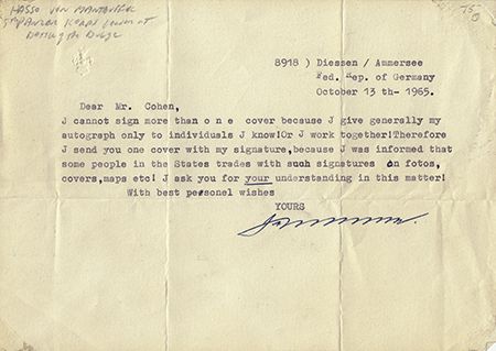 (1897-1978) Commander of the 5th Panzer Army which spearheaded the ill-fated Ardennes offensive of January 1945. After vainly requesting more help from a vacillating Hitler, he spoke despairingly of "a corporal's war". Later served as a delegate to the Bundestag (1953-7). T.L.S. 1p. oblong 8vo., Diessen, Oct. 13, 1965 to a collector saying that he only sends autographs to those he personally knows as he has learned that some people in the U.S. were selling his signed items. Pencil notes at top left, else fine.