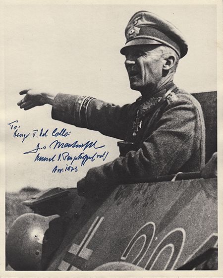 (1897-1978) Commander of the 5th Panzer Army which spearheaded the ill-fated Ardennes offensive of January 1945. After vainly requesting more help from a vacillating Hitler, he spoke despairingly of "a corporal's war". Later served as a delegate to the Bundestag (1953-7). Post-war I.S.P. adding rank as "General of Panzertruppen 9ret.) Nov. 1943", 8" x 10" b/w, a fine candid shot showing him commanding his men from the turret of a tank, boldly signed in blue ink. Fine.