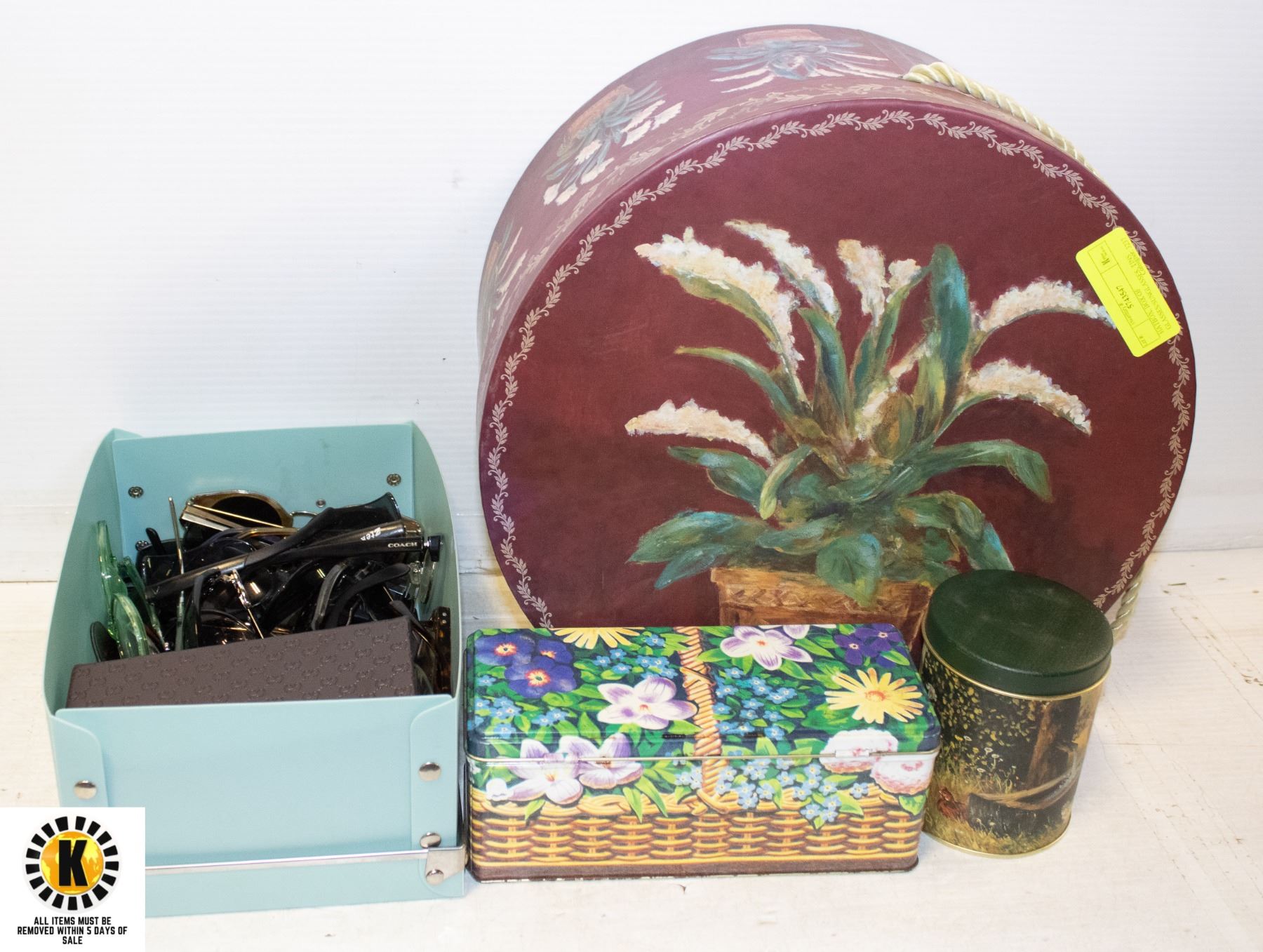 HATBOX, BOX OF GLASSES/SUNGLASSES, TINS