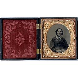 1/6 plate ambrotype on ruby glass of older woman. Black case has minor roughness at some corners.