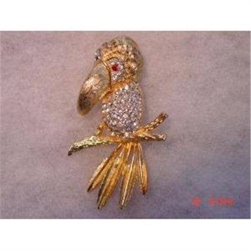 Here is a wonderful rhinestone bird brooch. Please help me with what kind of bird this is, parakeet? This appears to be from 1950-1960s is my guess. I'm quite sure this is a unsigned Hattie Carnegie or boucher bird brooch, I have seen ones identical to this in a book somewhere under these 2 designers. All the sparkling clear rhinestones appear intact around the tummy and around the eyes. There is a deep red rhinestone in each eye for the pupil! This measures 2 1/4 inches tall! Excellent condition, I do not see any wear on the gold metal!