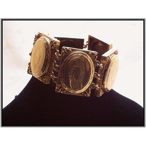 Offered here is a fabulous signed, Hattie Carnegie locket bracelet, pictured on page 146 of Georgiana McCall's book, Hattie Carnegie Jewelry. Featuring five, individual oval lockets, each measuring to hold a 1 inch photograph, with it's own ring to secure the photo. Each locket is engraved with a Victorian style design, and is framed with a square motif with a raised design. Measuring 8 inches in length and 1 1/4 inches wide and signed, it is in wonderful vintage, original condition. What an elegant and stylish way to wear keepsakes of loved ones.
