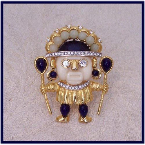 <table width="100%" border="0" cellspacing="0" cellpadding="4"><tr><td><em> Highly collectible Hattie Carnegie figural pin in superb vintage condition!</em></td></tr><tr> <td width="100%"> This is one of Hattie Carnegie's well known and very collectible figural or whimsical pins. It is pictured on page 135 of Georgiana McCall's book on Hattie Carnegie Jewelry. It is of a warrior and in superb vintage condition, with no visible wear to either the front or back. The warrior is of an etched goldtone body and dress, with pave set clear rhinestones decorating both the neck and headband. Ms. Carnegie's use of cream and blue plastic, so popular during that period, make up the face and other decorative parts of this pin. The headpiece is of a scalloped goldtone metal, adorned with cream colored glass beads and clear round rhinestones. All rhinestones are brilliant and clear, including the two largest stones, making up the eyes. Measuring 2.25 inches tall and 2 inches wide, this pin will make a definite conversation piece and is highly collectible. </td></tr><tr> <td> </td></tr><tr> <td>Reference #: GO_004PN</td></tr><tr><td>Condition:Superb, vintage condition</td></tr><tr><td>Year:1940's-1950's</td></tr><tr><td>Country:usa</td></tr><tr><td>Maker:Hattie Carnegie</td></tr><tr><td>Height:2.25</td></tr><tr><td>Width:2</td></tr><tr><td>Title:HATTIE CARNEGIE Brooch Pin, Bookpiece, Signed</td></tr><tr><td>Style:Brooch Pin</td></tr><tr><td>Materials:Etched Goldtone metal, rhinestones, glass beads and plastic composition</td></tr><tr><td>Location:Lake Tahoe, California</td></tr></table>