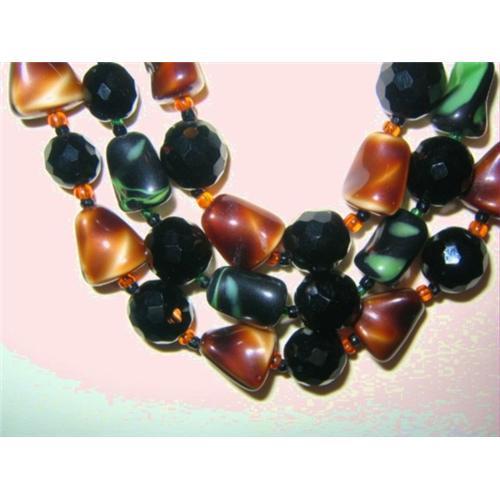 A PERFECT NECKLACE OF NATURAL SHAPED AND POLISHED STONES, AGATE AND MALACITE, WITH BLACK JET STONES. EARRINGS HAVE MATCHING BEADS. SIGNED BY HATTIE CARNIGIE. VERY COLLECTABLE.