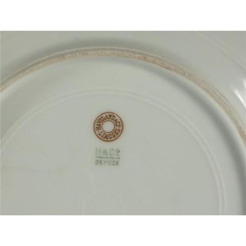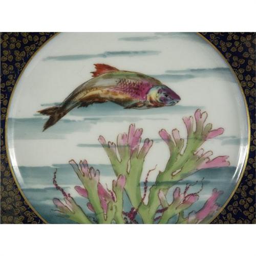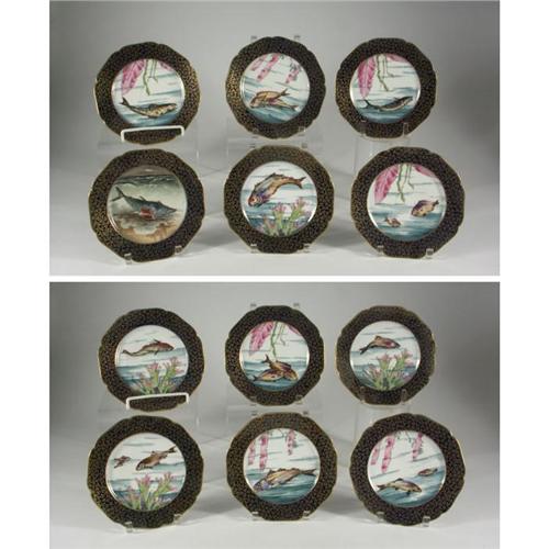 PORCELAIN: Twelve Haviland Limoges salad plates, fish in watery scenics mulit-colored transfer decorations in central reserves with hand painted accents, colbalt borders with gilt leaf design and scalloped edges, 8.25'', double marked with underglaze green mark (1876-1889), chip noted to edge of one and some wear to gilding.