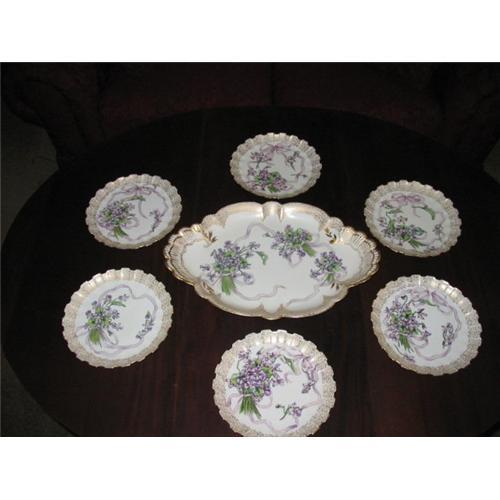 MAGNIFICENT EARLY HAND PAINTED HAVILAND LIMOGES SEVEN PIECE ICE CREAM SET (H & CO) IN MINT CONDITION. THIS SET WHICH FEATURES BEAUTIFULLY PAINTED VIOLET CLUSTERS WAS APPARENTLY NEVER USED DUE TO ITS COMPLETELY PRISTINE CONDITION. THE LARGE PLATTER IS A MASSIVE 15.25" BY 10" AND THE SIX SERVING PLATES ARE 7.75" IN DIAMETER. THERE IS SUBSTANTIAL INTRICATE AND DELICATE GOLD GILDING ON ALL PIECES AS CAN BE SEEN IN THE IMAGES. THE COLORATION OF THE VIOLETS AGAINST THE LIMOGES CREAMY BACKGROUND FRAMED IN THE GILDING IS AS IMPRESSIVE AS LIMOGES GETS. THE HAVILAND MARK IS H & CO MARK 8
