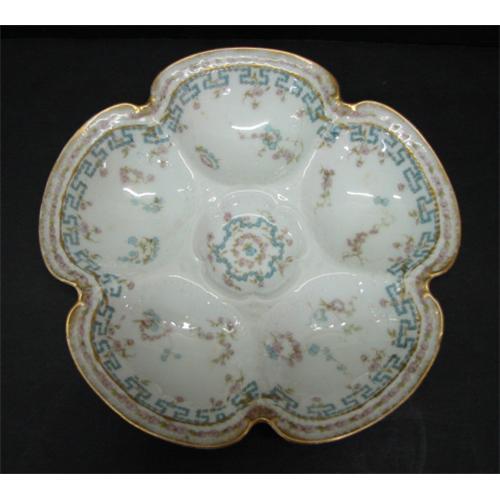 HAVILAND & COMPANY LIMOGES PORCELAIN OYSTER PLATE. Gilt decorated border with lavender and blue floral decoration. Marked on bottom. 8.75" Dia.