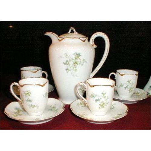 Pretty HAVILAND Limoges chocolate set consisting of pot, 4 cups and saucers. All decorated with blue harebells and gold. Very pretty set. Ransom shaped cups. Haviland mold and decorator marks on bottoms as shown in photo.