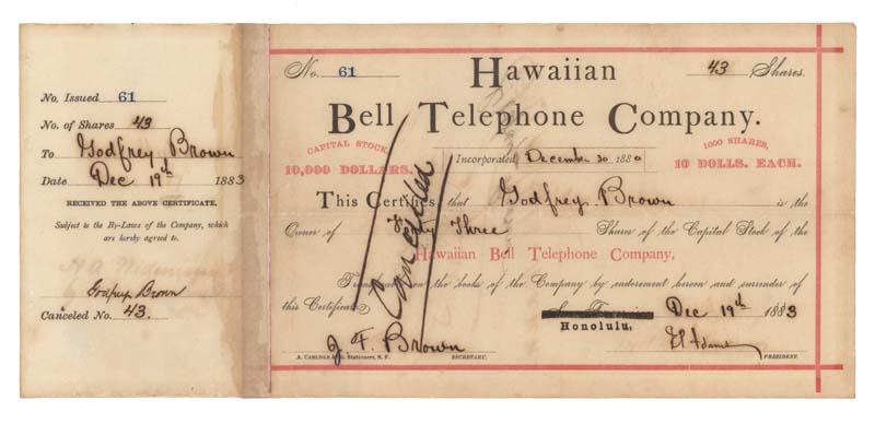 1883, Honolulu, Hawaii. Stock certificate for 43 shares. Red/Black. Among the earliest of Hawaiian telephone companies, Hawaiian Bell was organized in 1880. It later merged with the Mutual Telephone Company in 1894. A choice early Hawaiian telephone stock. Pen cancelled and Fine.