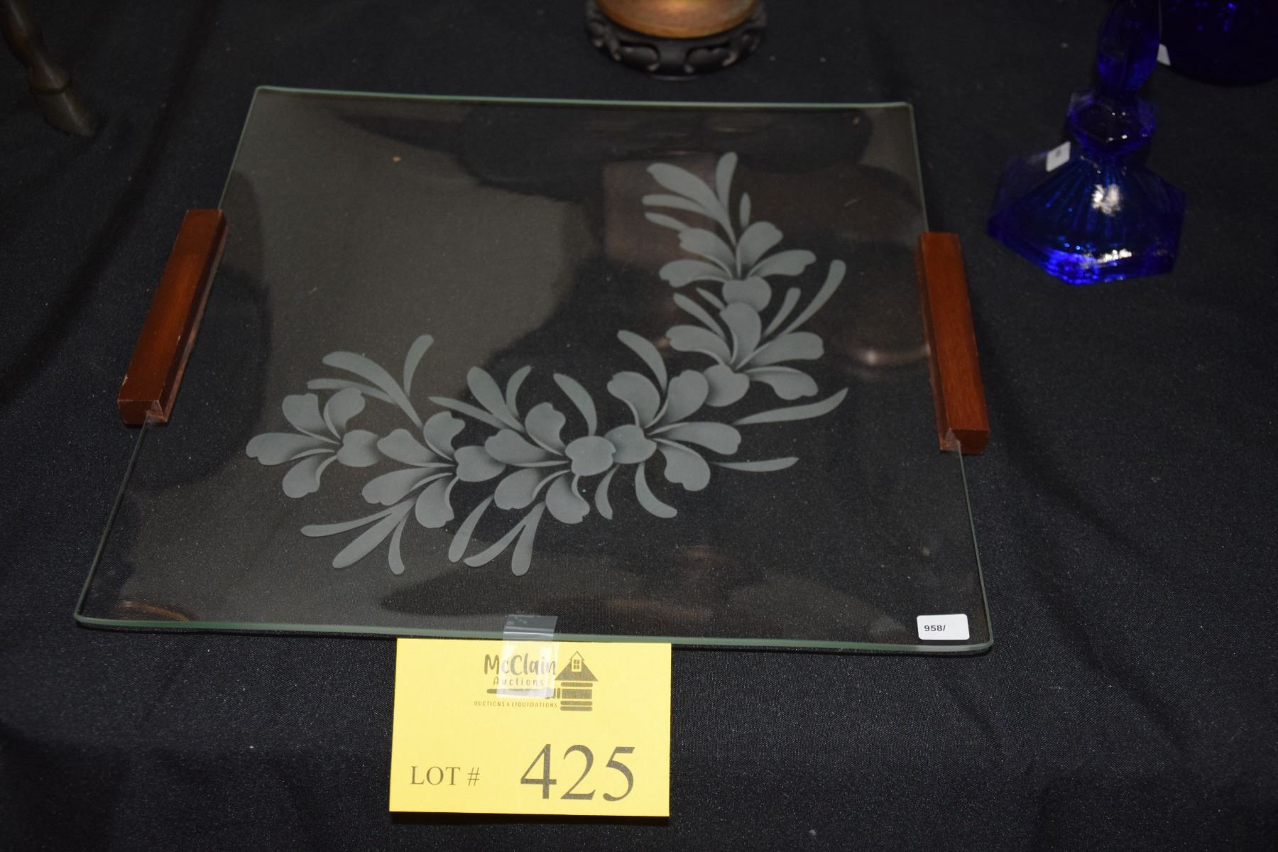 HAWAIIAN ETCHED GLASS "PLUMERIA" TRAY W/WOOD HANDLES (14 1/2" X 13 1/2")