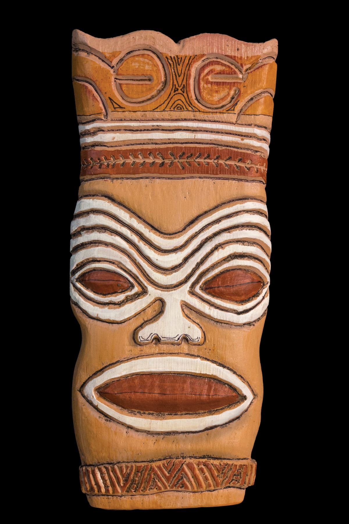 (2000s) An impressive LeRoy carving of a Hawaiian mask with sharp coloring. Both carved and written signatures on the back: LeRoy Schmaltz/Oceanic Arts. 25"x11". VG+ with typical wear.