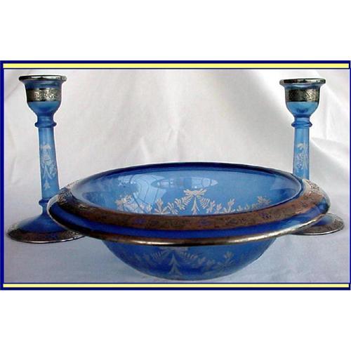 Engraved cased blue over clear glass with silver overlay trim, centerpiece bowl and matching pair of candlesticks made by Hawkes, late 19th or early 20th century.<BR>Bowl is 9 inches in diameter (accross the top) and candlesticks are 6inches high.<BR>Beautiful sky blue colour engraved to reveal the clear glass below, in a pattern of tulips, orchids and swags of foliage. Borders have silver bands, the widest of which have detailed patterns of scrolling flowers and foliage over a textured and openwork background. <BR>Etched marks: under candlesticks the trefoil ring enclosing a fleur-de-lis and 2 hawks and under the bowl, engraved name HAWKES.<BR>Condition is good with no chips or cracks. There is very minor wear to the silver and one candlestick has a few tiny surface scratches on the base, shown magnified in the 'photos.