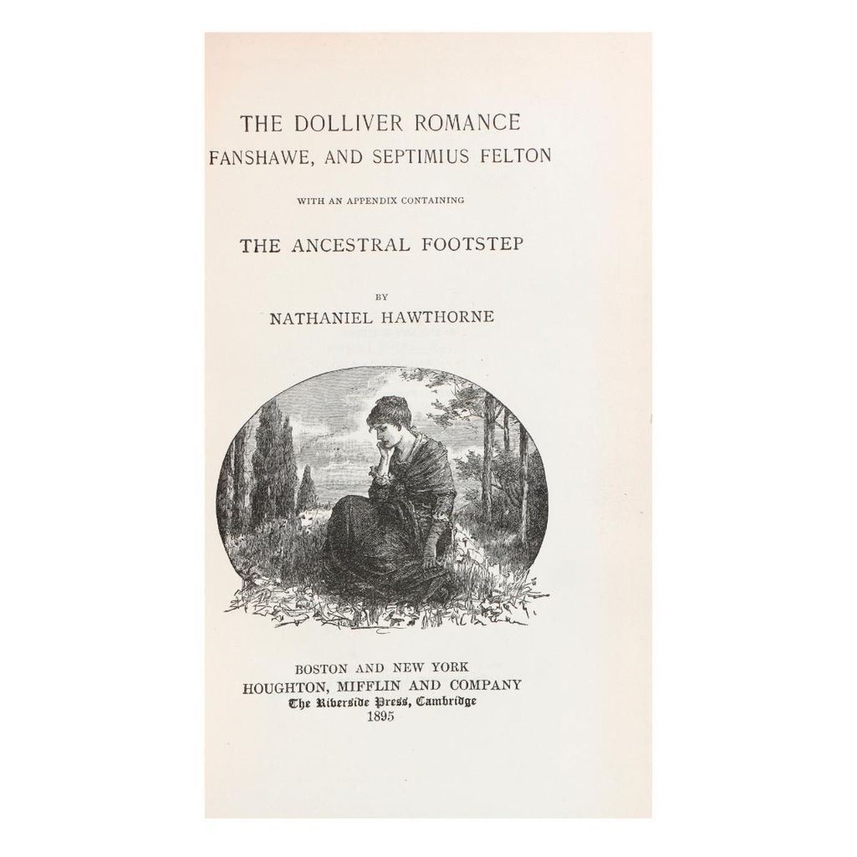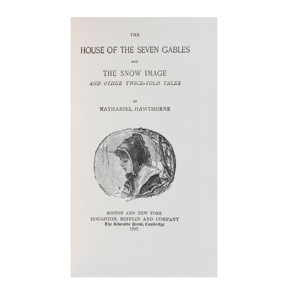 Six volumes of Hawthorne's Works (of a 13-vol. set). Boston and New York: Houghton, Mifflin and Company, Riverside Edition, 1893-1895. 8vo. Half gilt-bordered brown morocco and blue marbled boards and endpapers, top edges gilt, illustrated title pages and frontispieces. Fair-Good condition; all with edgewear; Vol. VI in poor condition with front board detached, and spine leather detached with losses. Note: Some of the volume numbers are only indicated on the spines, do not match volume numbers on title pages, or no volume number is noted on title page. Includes: Vol. 3 House of the Seven Gables and The Snow Image and other Twice-Told Tales, 1893; Vol. 4 A Wonder-Book Tanlgewood Tales, and Grandfather's Chair, 1894; Vol. 6 The Marble Faun or The Romance of Monte Beni, 1894; Vol. 7 (Vol. I) Our Old Home, and English Note-Books, 1894; Vol. 8 (Vol. II) Our Old Home, and English Note-Books, 1894; Vol. 11 The Dolliver Romance, Fanshawe, and Septimius Felton, with an Appendix Containing The Ancestral Footstep, 1895.