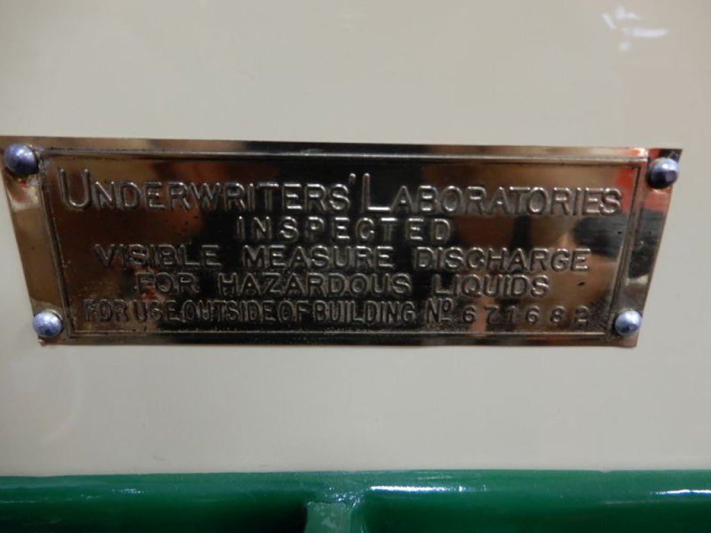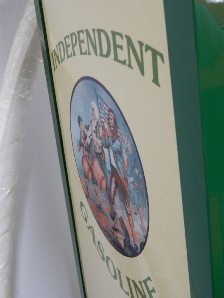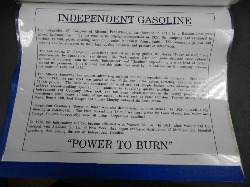 HAYES EQUIPMENT MFG SINGLE VISIBLE 5 GAL GAS PUMP PROFESSIONALLY RESTORED TO INDEPENDENT GASOLINE - ALTOONA, PA - 15 1/2" LIMITED EDITION BY PERGL LENSES NO. 68 OF 100 - DOUBLE NUMBERED 5 GALLON CYLINDER WITH SMALL CHIP - INCLUDES CERTIFICATE LOCAT
