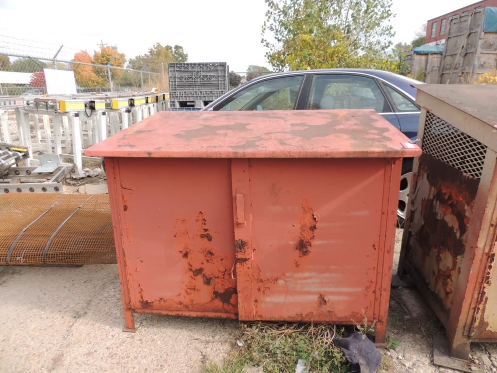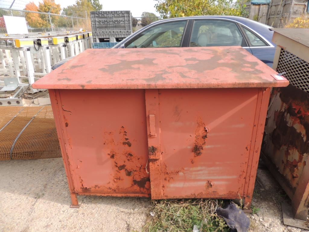 INDOOR / OUTDOOR HAZARD STORAGE BOX, STEEL STORAGE, FLAME PROOF, COMPRESSED GAS, PROPAINE STORAGE, SAFETY STORAGE BOX AS SHOWN SEE PHOTO FOR MORE DETAILS.