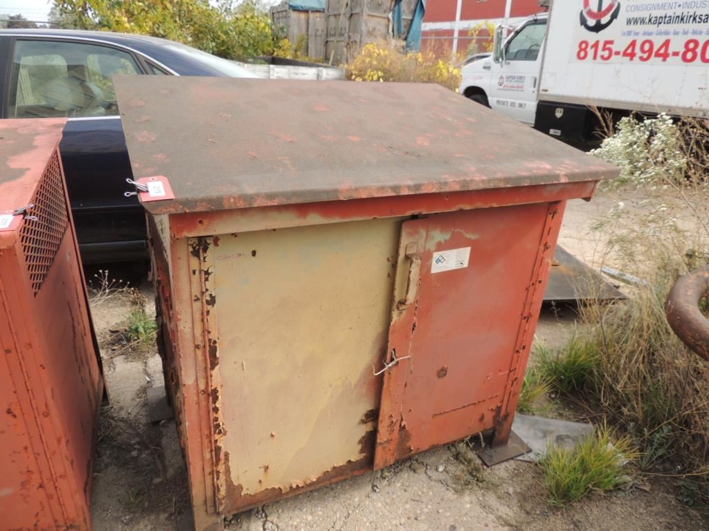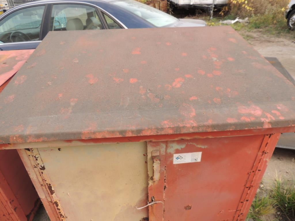 INDOOR / OUTDOOR HAZARD STORAGE BOX, STEEL STORAGE, FLAME PROOF, COMPRESSED GAS, PROPAINE STORAGE, SAFETY STORAGE BOX AS SHOWN SEE PHOTO FOR MORE DETAILS.