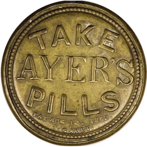 <B>HB-26 EP-183 a Scott-unl. Reed-AP90 90c Take Ayer's Pills Extremely Fine.</B></I><BR> The case is a natural, light brass with golden overtones and tiny traces of silver behind a few of the letters. The stamp is very fresh and centered a little to the lower left, and the mica has some crazes and cracks, particularly toward the bottom center, but they do little to block the view of the beautiful stamp. Listed as an R-9 (two to four known) in Reed, with the comment "2 known?" This piece was previously in the Massachusetts Historical Society Collection, which was auctioned by Stack's in May of 1971. The only other known example was sold at auction for $13,000 in June of 1980 by Fractional Currency Inc. It is now in the ANA museum.<BR><I>From The Frederick R. Mayer Collection</B></I><BR><BR><b>Shipping:</b> Coins & Currency (<a target="_blank" href="http://www.heritageauctions.com/common/shipping.php">view shipping information</a>)