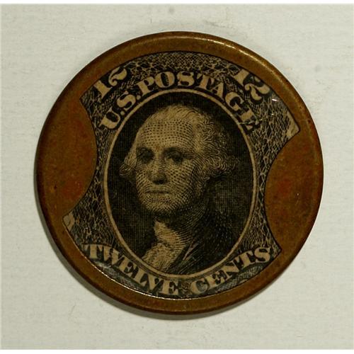 <B>HB-135 EP-148 12¢ J. Gault Extremely Fine.</B></I> A flawless, clearly original example of the most available of the 12¢ encasements. The case is a medium brown with some reddish highlights, the mica virtually flawless and the stamp primarily bright with a little darker toning at the very top. A handsome piece and an ideal representation of this scarce denomination.<BR><BR><b>Shipping:</b> Coin/Currency (<a target="_blank" href="http://www.heritageauctions.com/common/shipping.php">view shipping information</a>)
