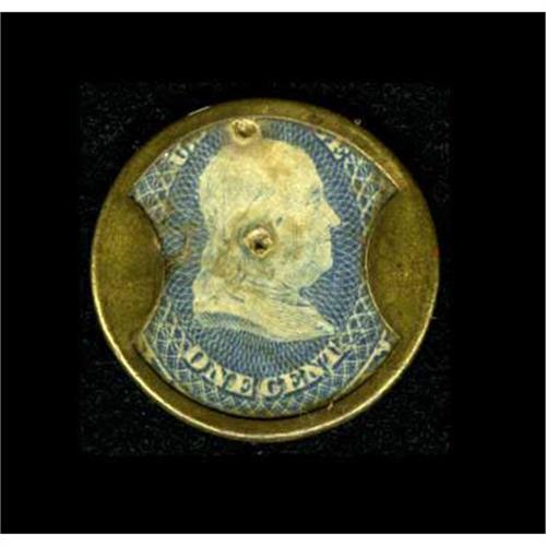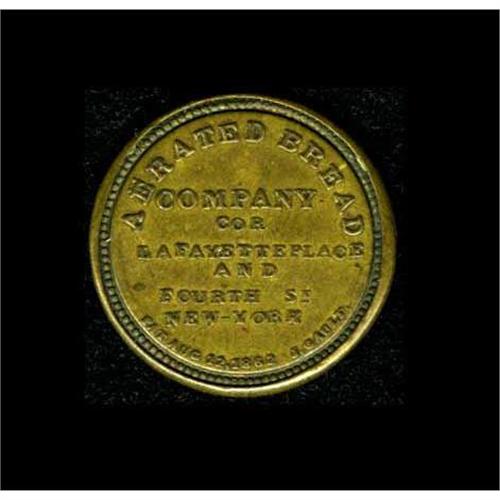 <B>HB-1 EP-1 1¢ Aerated Bread Very Fine.</B></I> A rare merchant represented by only the 1¢ denomination and a unique 5¢ example. Only about 15 Aerated Bread pieces are known, and they seldom reach the market in any condition. This one is lightly circulated with an ideal light tan coloration. The stamp is well centered and bright, the mica has a few problems, the most noticeable of which are two indentations that are not quite holes, one immediately above Franklin's head and the other right around his ear. An attractive enough example of this extremely rare merchant. It is attributed by our consignor to the February 1969 Stack's auction.<BR><BR><b>Shipping:</b> Coin/Currency (<a target="_blank" href="http://www.heritageauctions.com/common/shipping.php">view shipping information</a>)