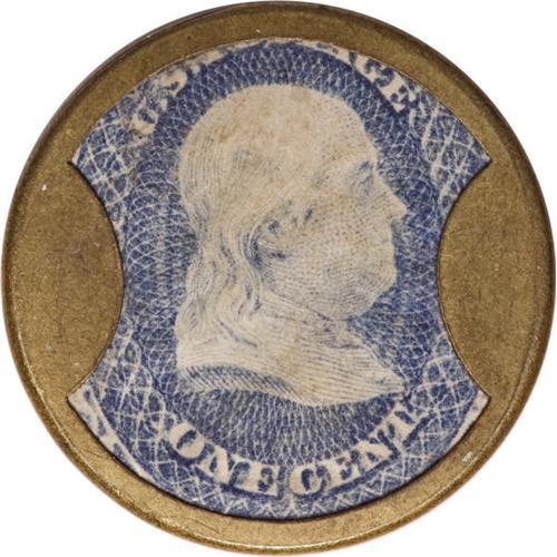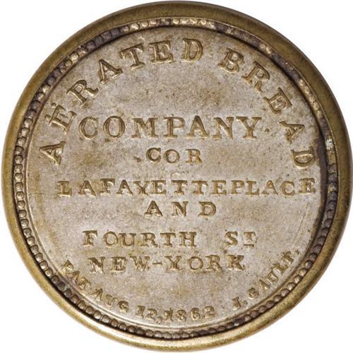 <B>HB-1 EP-1 Scott-1 Reed-AB01 1¢ Aerated Bread Choice About Uncirculated.<BR>Numerical grade: 85case.70stamp.85mica. = 240</B></I> An incredible example of a rare and very popular merchant. The case is fully about uncirculated, with over 95% of its original silvering remaining on the back. The silver is missing only from the high points on the letters. The mica is very nearly perfect, with only the most minor of disturbances at its very edge. The stamp is beautifully centered, but it has toned down just a touch. The One Cent is the only collectable denomination for this merchant. Fred Reed shows 56 auction appearances between the years 1891 and 1994, which includes considerable duplication. He lists the piece as an R-7, indicating eleven to fifteen known. The Hodder-Bowers reference agrees, stating "...very rare, with under fifteen different specimens believed to survive." While fifteen known usually does not command a very high premium for an encasement, this Aerated Bread 1¢ is in a different category. It is the only denomination available for the merchant other than the 5¢ (appearing below) which is unique, and no other denominations were produced. We've handled one other Aerated Bread comparable to this piece, and we believe these two to be far and away the finest known.<BR><I>From The Frederick Mayer Collection</B></I><BR><BR><b>Shipping:</b> Coins & Currency (<a target="_blank" href="http://www.heritageauctions.com/common/shipping.php">view shipping information</a>)