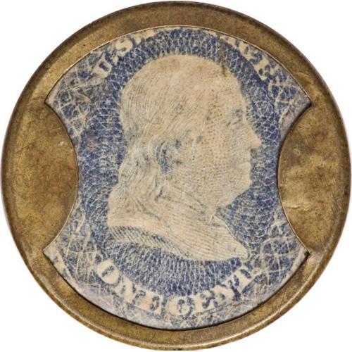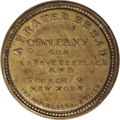<B>HB-1 EP-1 Scott-1 Reed-AB01 1¢ Aerated Bread Very Fine.<BR>Numerical grade: 55case.50stamp.70mica. = 175</B></I> In spite of a fair degree of mishandling, this is still an excellent example of this very rare merchant. The case has some minor denting and a number of marks along with a slightly irregular seam. The mica has a number of surface dents as well as with some craze marks but is substantially clear. The stamp is somewhat toned down and lightly soiled. This piece is an interesting object lesson. Were it a higher denomination, rare variety, etc. one would be very suspicious that it had been opened and re-closed. Common sense dictates, in this case, that that has not happened. Neither the mica nor the stamp has been switched. Both are average at best, and as this is the only collectable denomination of the merchant, the only possible incentive for a switch would be to attempt to upgrade the stamp or mica. Clearly that has not happened. The point here is simply that marks, dings and minor bends do not necessarily indicate chicanery. They may simply be, as in this case they clearly are, marks, dings and minor bends. Nonetheless, this is an about average example of a very rare merchant.<BR><I>From The Frederick Mayer Collection</B></I><BR><BR><b>Shipping:</b> Coins & Currency (<a target="_blank" href="http://www.heritageauctions.com/common/shipping.php">view shipping information</a>)