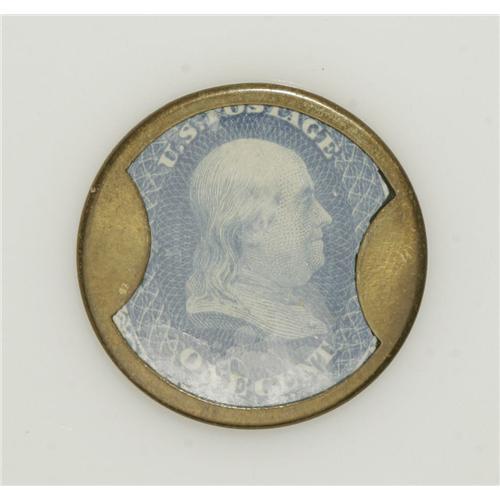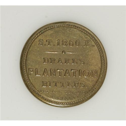 <B>HB-100 EP-13 1¢ Drake's Plantation Bitters About New.</B></I> The case is a gorgeous, natural glossy brass color, with virtually no traces of circulation. The stamp is a fully brilliant blue and it is very nicely centered. The mica is essentially perfect, too. Not a rare piece, but in extraordinary condition.<BR><BR><b>Shipping:</b> Coin/Currency (<a target="_blank" href="http://www.heritageauctions.com/common/shipping.php">view shipping information</a>)