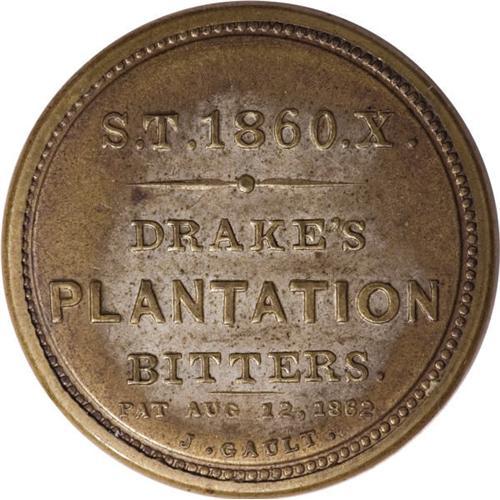 <B>HB-100 EP-13 Scott-70 Reed-DR01 1¢ Drake's Plantation Bitters Choice About New.<BR>Numerical grade: 85case.80stamp.70mica. = 235</B></I> A common encasement, rated as an R-2 (51-100) by Reed, which is no doubt accurate. This is a particularly nice piece. The case is flawless and with about half of its original silver remaining, all of which is concentrated in the center. This is one of perhaps a dozen encasements we've seen where a different method was used to seal the case. The front of the case reaches onto the beading all the way around, and has been sealed in such a way that the final millimeter before the seam is fully flattened. The stamp is fully fresh and nicely centered, the mica has a few laminated areas visible under angled light and a short crack, craze and separation at the lower right from the point of the Franklin vignette to the edge.<BR><I>From The Frederick Mayer Collection</B></I><BR><BR><b>Shipping:</b> Coins & Currency (<a target="_blank" href="http://www.heritageauctions.com/common/shipping.php">view shipping information</a>)