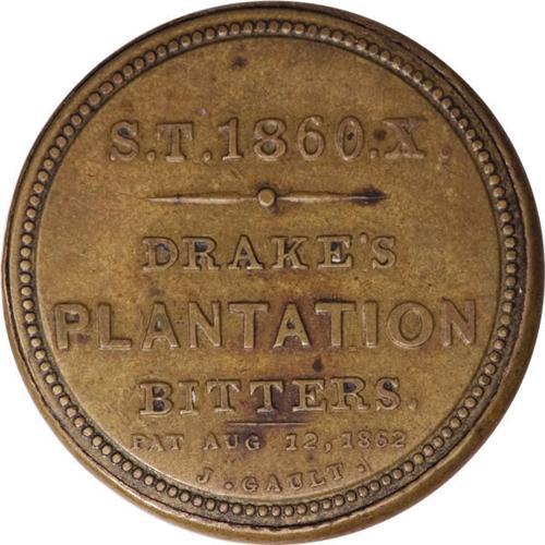 <B>HB-100 EP-13 Scott-70 Reed-DR01 1¢ Drake's Plantation Bitters Extremely Fine.<BR>Numerical grade: 70case.50stamp.80mica. = 200</B></I> A fascinating piece which we sold to Mr. Mayer as Lot 241 from CAA's September 1999 Cincinnati sale. Our description there read, "This is a nice piece in its own right, but what makes it special is the fact that the stamp in this encasement has been postally used. A light red cancel is visible across the face of the stamp, and although its place location can't be certain, the word "CITY" can be discerned. This is the only encasement we know of that was clearly made with a canceled stamp, and it is legitimate beyond question, as there are absolutely no indications of tampering with the case." There are other encasements known, with at least traces of cancels but this is the only clearly canceled stamp we know of in a decidedly untampered case. Speculation can be endless as to whose pocket the extra money fell into when used, rather than new, stamps were employed in encasements. This cataloger's opinion is that it was likely on the Scovill manufacturing part of the process where this self-serving act was committed.<BR><I>From The Frederick Mayer Collection</B></I><BR><BR><b>Shipping:</b> Coins & Currency (<a target="_blank" href="http://www.heritageauctions.com/common/shipping.php">view shipping information</a>)
