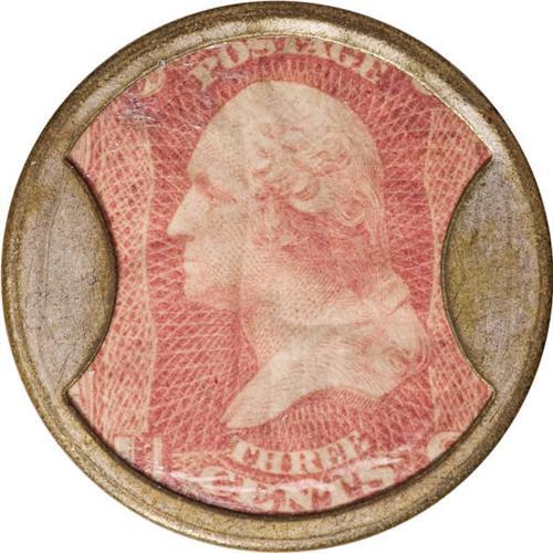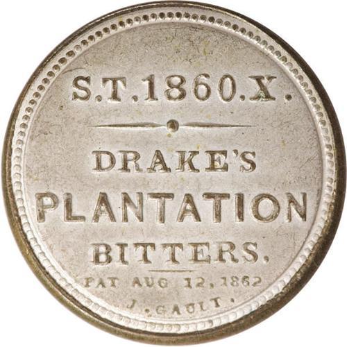 <B>HB-101 EP-42 Scott-71 Reed-DR03 3¢ Drake's Plantation Bitters Choice New.<BR>Numerical grade: 95case.80stamp.70mica. = 245</B></I> Mr. Mayer acquired this piece from a CAA sale a number of years ago where it was described, "This piece, although not rare, is one of the most astounding quality pieces of encased we have ever handled. In fact, this cataloger can recall only one finer example (a 5¢ Shillito) of any issue. The piece has 95% of its original silver, including a considerable amount on the half moons on the face. An extraordinary piece of Encased that should be vigorously pursued by the specialist." We're just as impressed with this piece now as we were last time. The silvering remains even on most of the high points of the letters. The stamp is fresh and well centered, and the mica shows only a few as-made crazes and separations at its very edges but is primarily crystal clear.<BR><I>From The Frederick Mayer Collection</B></I><BR><BR><b>Shipping:</b> Coins & Currency (<a target="_blank" href="http://www.heritageauctions.com/common/shipping.php">view shipping information</a>)